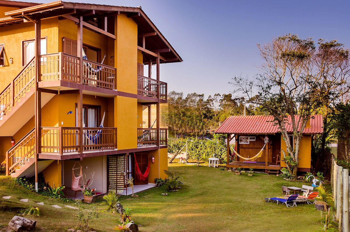 Amplo, confortável, privativo, acesso individual Ideal p/ casal jovem ou 4 pessoas, de bem com a vida -Quarto c/ cama box queen, Ar Condicionado Quente e Frio e vent. de teto -Sala c/ TV 32 Smart, bicama p/ 2 solteiros, ventilador -Varanda com rede, vista p/ montanhas -Cozinha completa e funcional -Jardim e churrasqueira (uso comum) - Wi-fi estável fibra 100mb -Local tranquilo, seguro e fácil acesso ao Rosa e outras praias da região. -5 min. da praia de carro (2 km) -1km do centrinho