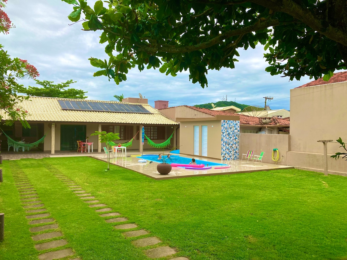 Uma casa super espaçosa e bem localizada para suas férias em família. Está localizada no centro, em uma área tranquila e familiar. Pertinho de mercado, padaria, farmácia e restaurantes. >>400m da rua principal do centro >>1000m da beira mar >5min a pé do mercado Komprão atacadista Pátio todo cercado com muro, seu pet será muito bem-vindo (limite máximo de 2 pets, taxa única de R$ 100,00 por pet)