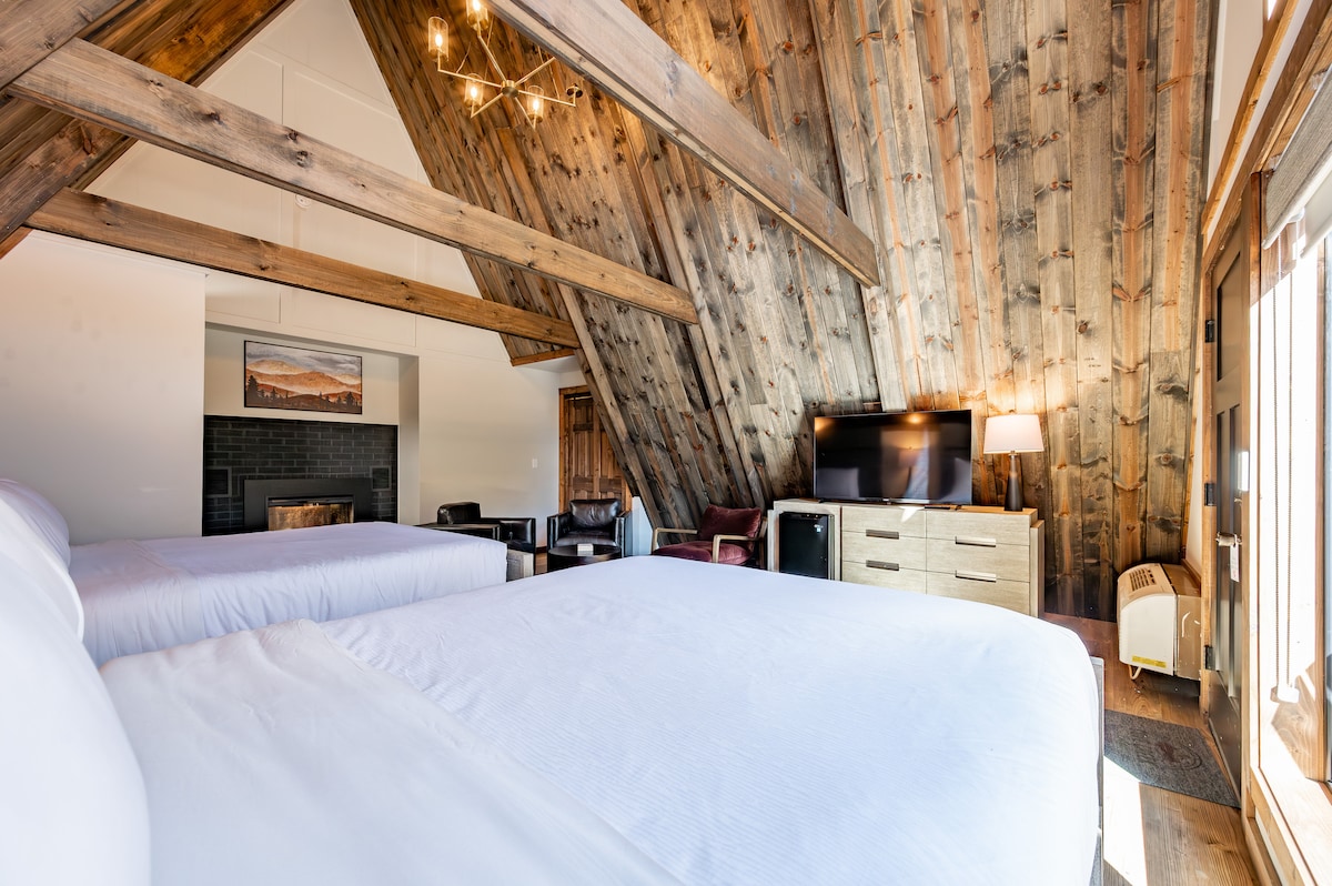 Unwind & Relax in this log cabin styled spacious vaulted peak ceiling room with two Queen beds and an electric fireplace for everyone to enjoy. Equipped with a luxurious bathroom with a walk-in shower, quality bath products, Kitchenette, and Smart TV. Enjoy the fresh mountain air and your morning coffee by walking right out your door to the deck, where you have two chairs and views of the seasonal outdoor pool.