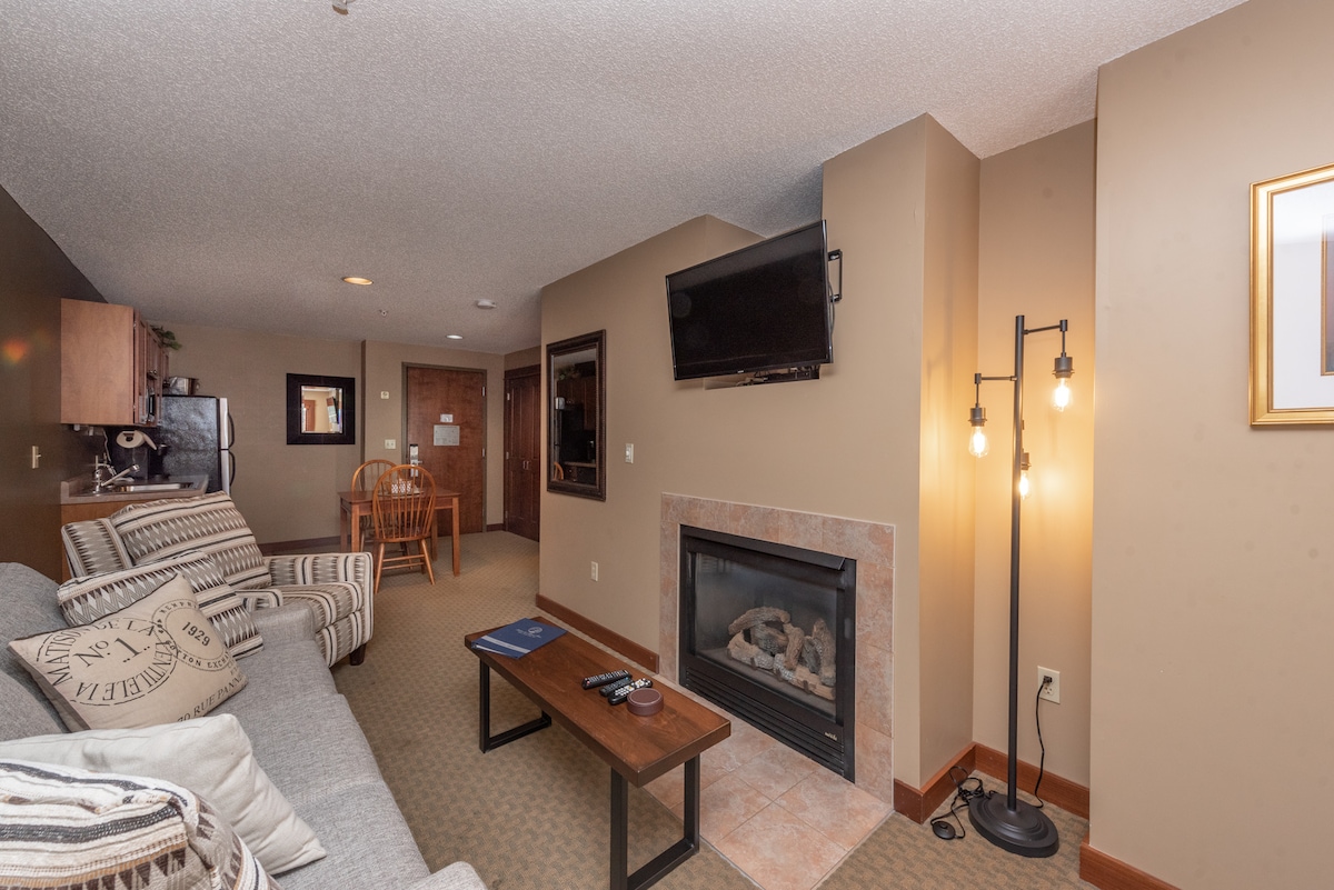 First-floor queen one-bedroom suite (end unit) with standard views and gas fireplace. (Elevator access included) Hotel amenities include an onsite marina (seasonal), onsite dining, game room, fitness room, sauna, free WIFI, and reading loft! Ask our front desk ahead of your arrival about adding on romance/massage packages or renting conference rooms for your business trip!