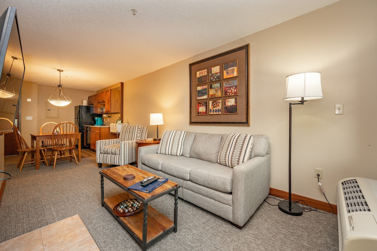 Welcome to our Charming and Cozy Studio! Immerse yourself in the comfort of our stylish studio, available for daily needs. Located in the Lodge section, overlooking either ski slopes or the courtyard. As you step inside, you'll be greeted by a warm, inviting space that feels just like home. The studio is tastefully furnished, featuring two queen beds (accommodate up to 4 sleeps), a 32" television, a mini-refrigerator, a coffee maker, and an iron/ironing board.