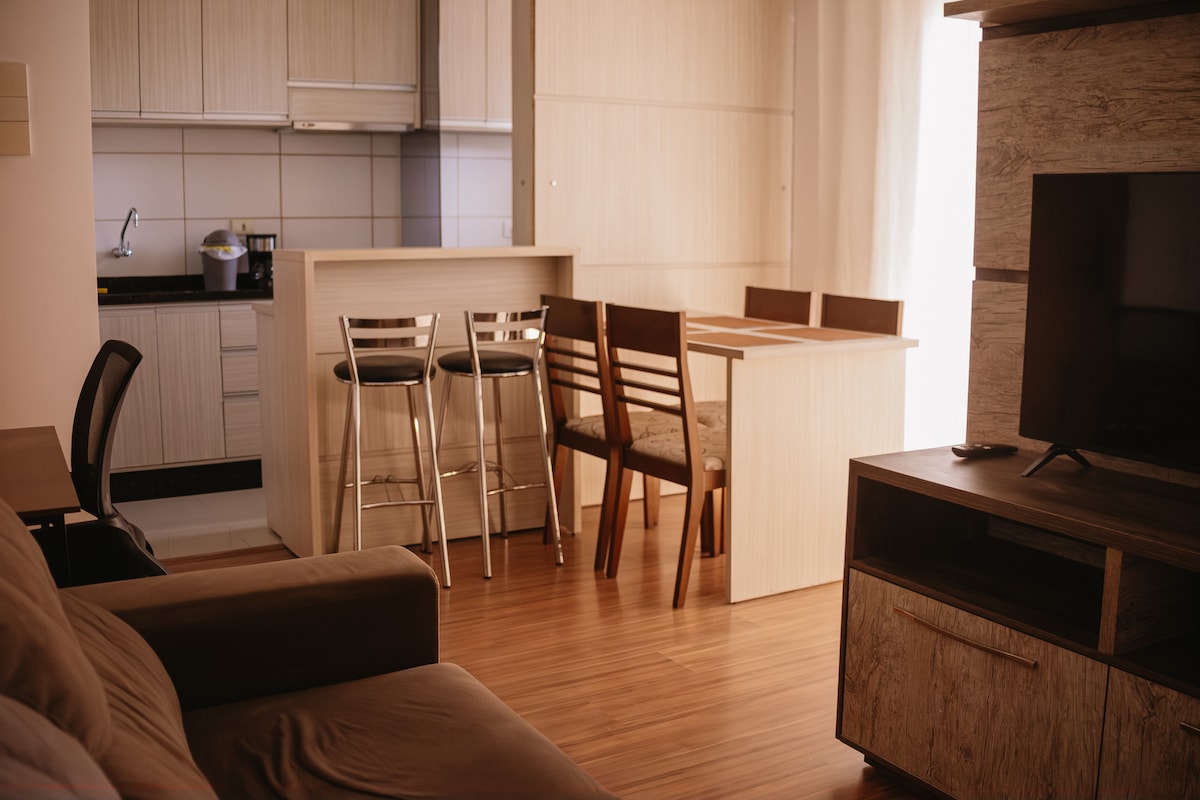 Apartamento confortável, bem planejado e com ótima estrutura para sua estadia. Está localizado em uma rua bastante movimentada, com tráfego de carros ao longo do dia e da noite. O espaço conta com porta de vidro, veneziana e cortina blackout para oferecer mais conforto. Ambiente organizado, com tudo o que você precisa para uma experiência prática e tranquila.