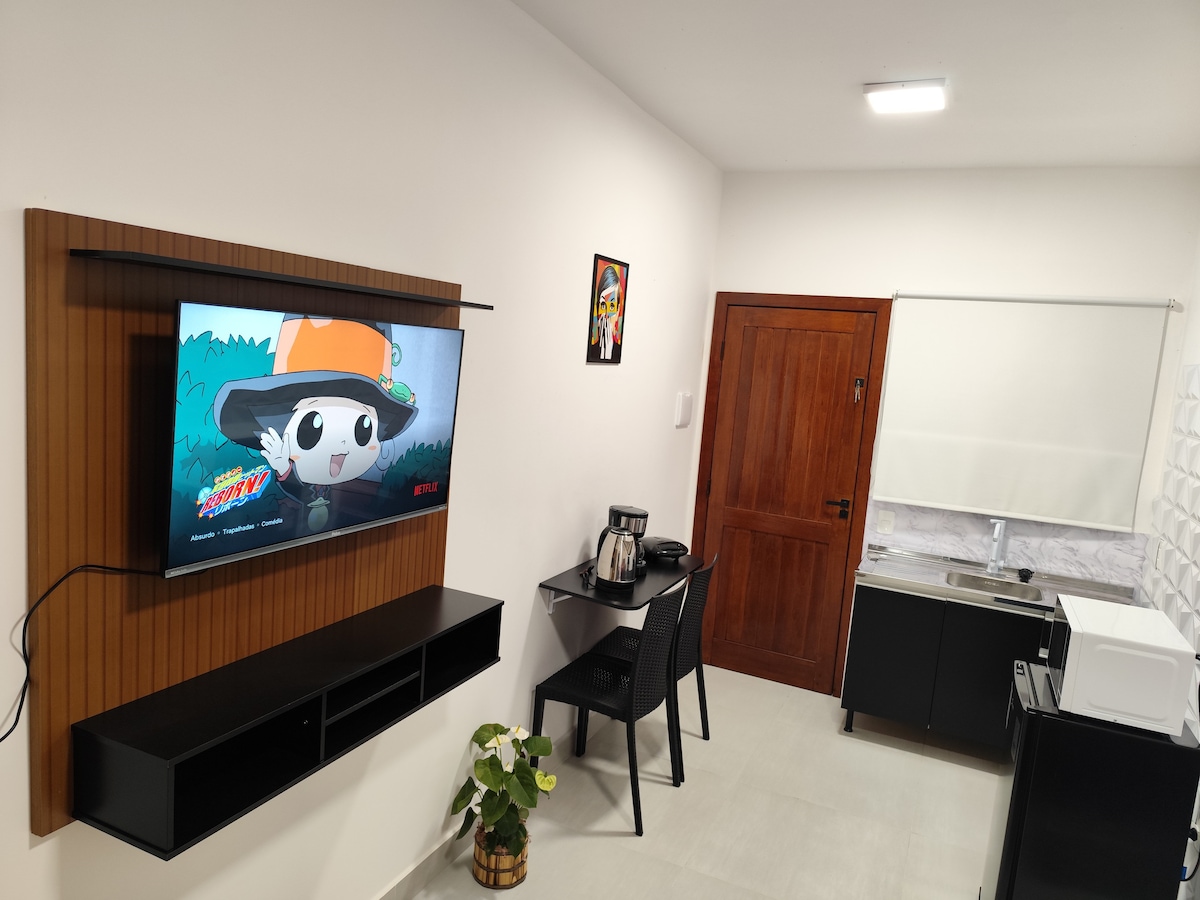 Reconecte-se a quem você mais ama neste lugar ideal para famílias.Um banheiro, 1 quartos com roupa de cama e 3 camas no total uma cozinha com fogão, geladeira, micro-ondas, talheres e louças. possui ar, uma televisão e um lugar para trabalhar online Animais de estimação são bem vindo no Máximo 2. obs: Prezado(a), Informamos que o uso do estacionamento é permitido apenas durante a permanência do hóspede na hospedagem. Não será autorizada a permanência do veículo no local na ausência do hóspede.