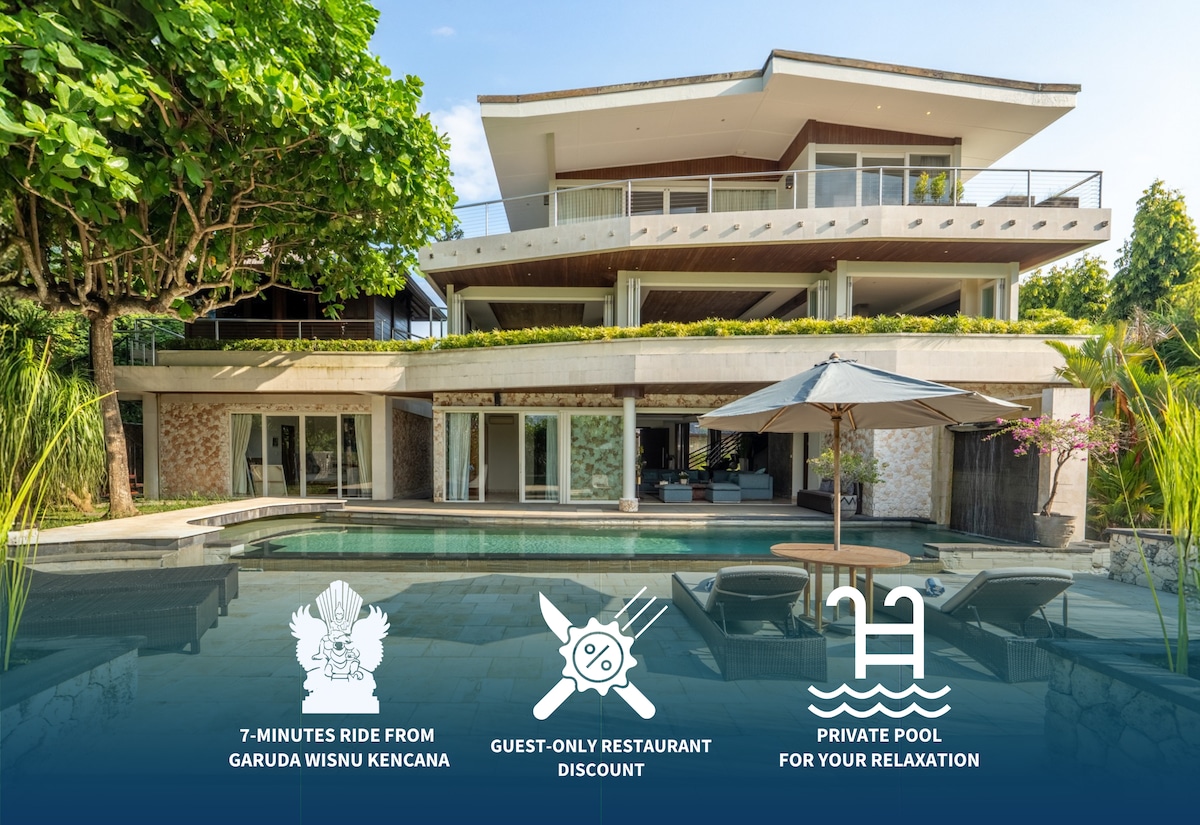Luxurious 3-storey private villa, a true paradise in South Bali. Our stunning L-shaped infinity swimming pool is the centerpiece of the spacious lounge/dining area, providing a unique and tranquil setting for you to relax and unwind. Surrounded by a lush green parkland, only 20mins from the airport, and close to surfing beaches. A FREE CAR and DRIVER are included, allowing you to explore Bali's with ease. We provide 2 full-time cleaners and have a CHSE certificate for your peace of mind.