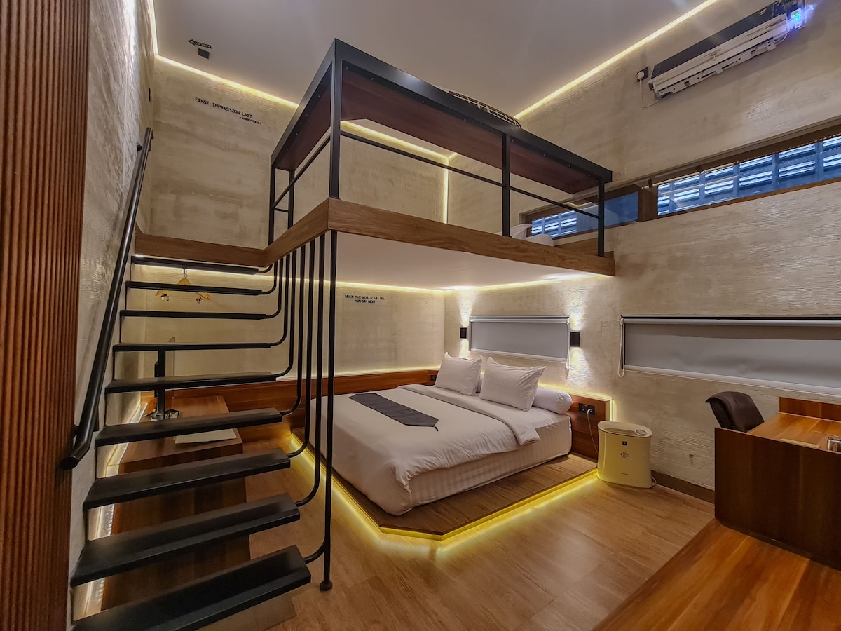 2x PREMIUM KING BED (180x200) 4 Adults Non Smoking Fast 5G WIFI : 60 - 80 Mbps ANDROID TV NETFLIX READY Max 2 adults per room Size with Mezzanine - 27m2 (2 floors) bathroom with bathtub Work Space Access to Roof Top Young Adults only (15 - 60 years)