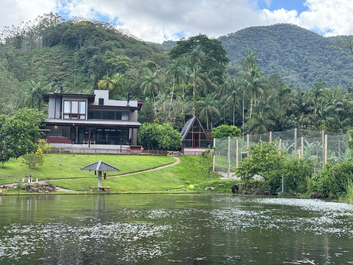 Refúgio de alto padrão na Estrada Bonita, Joinville/SC. Casa moderna com lareira, jacuzzi, área gourmet e vista para o lago. Cozinha completa, cervejeira, adega, churrasqueiras interna e externa, quadra de areia e mini-bosque. Acomoda até 6 pessoas com conforto. Para grupos acima de 6 hóspedes, o chalé anexo é disponibilizado, um espaço independente com varanda e churrasqueira privativa, garantindo ainda mais comodidade e privacidade. Próxima a cachoeiras, restaurantes e cafés da região.