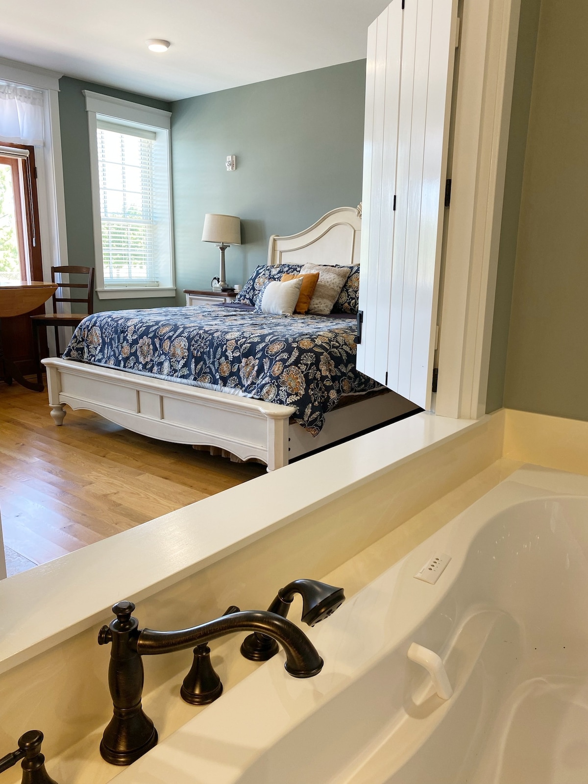 Johannes Blust is a multi-room Suite that occupies the main floor of the Blust Cottage, which is with-in walking distance from main building. The suite has a small dining area, sink, and small dining table. The suite has a King bed, oversized jacuzzi tub, and walk-in shower. Breakfast is included Blust Haus also includes the Himmelstreppe room.