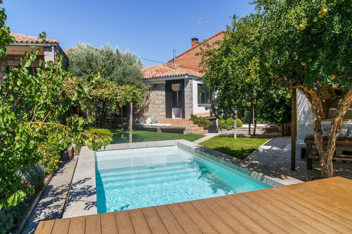 Disfruta de la Sierra de Madrid en nuestra preciosa casa de piedra rodeada de vegetación. Te despertarás cada mañana con vistas a un increíble jardín con árboles frutales y flores y podrás tomar el desayuno en una gran terraza mirando el monte. Detalles como la escalera de caracol o los arcos de piedra hacen de nuestra casa un sitio especial y diferente. La piscina es súper refrescante durante estos meses y tiene iluminación nocturna para que puedas disfrutar de un baño bajo las estrellas.
