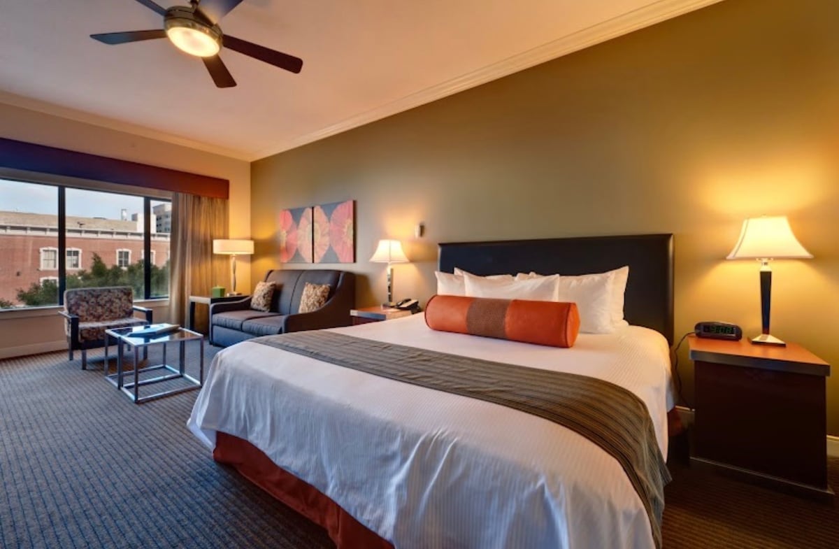 Enjoy the expansive comfort of a king-size bed in the Z King room, perfect for sharing or stretching out solo. Stream your favorite shows on the 43" HDTV with high-speed WiFi, and unwind in European-style double duvets, oversized towels, and micro-fiber bathrobes. Indulge in Tommy Bahama bath products and start your day with unlimited Keurig coffee and bottled water. This room blends playful luxury and relaxing amenities for a truly memorable stay.