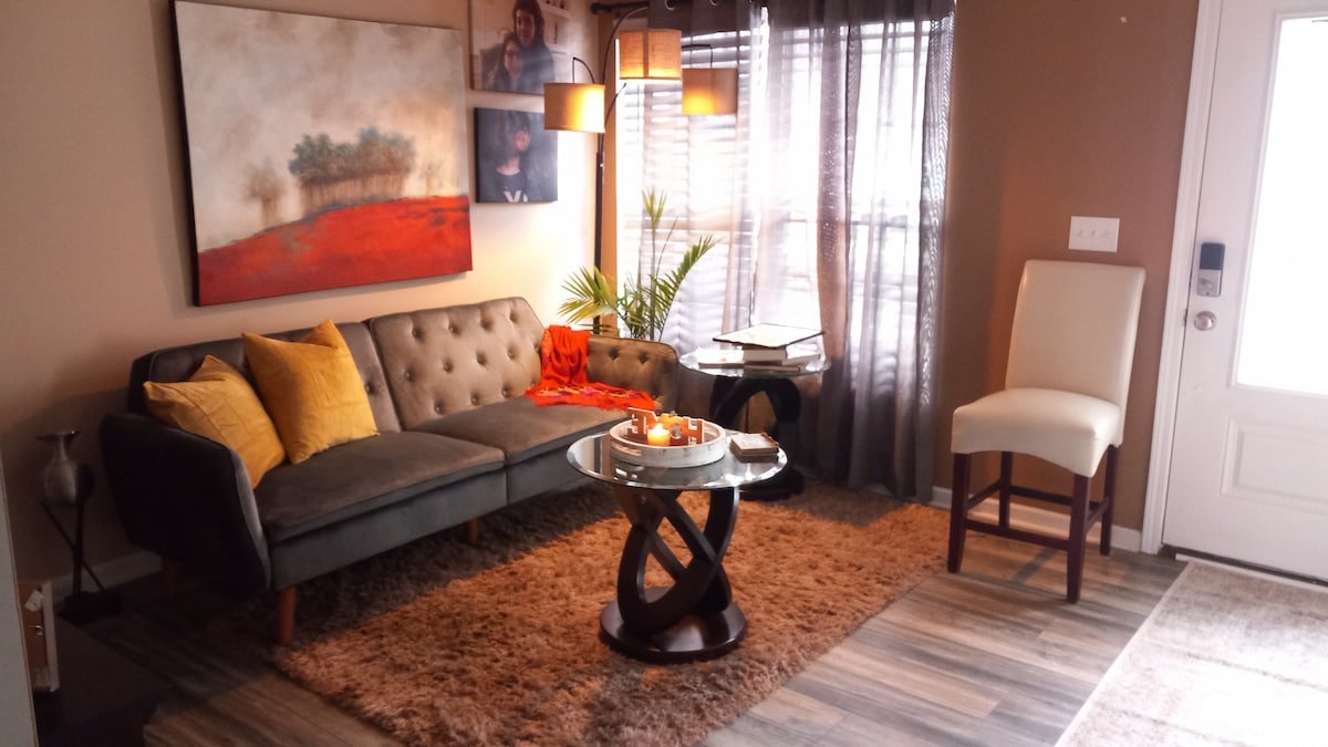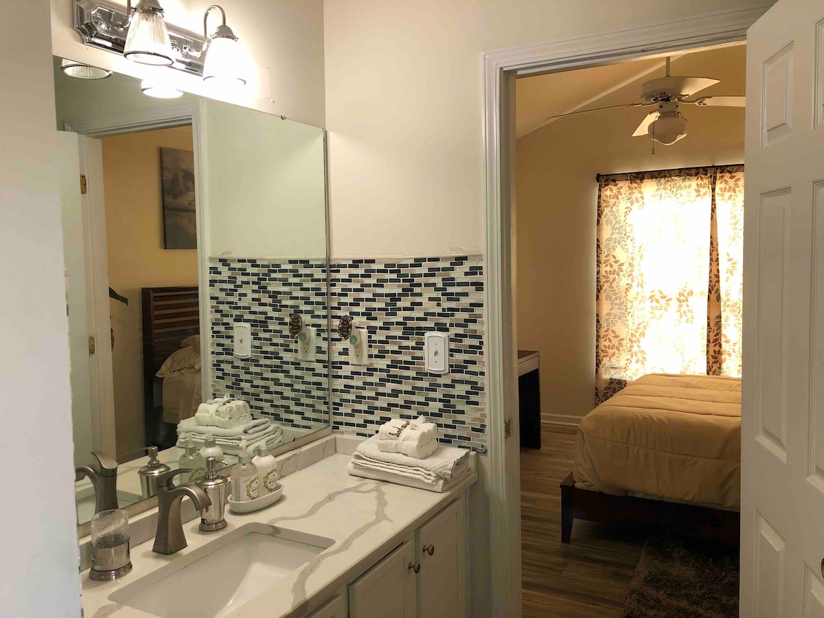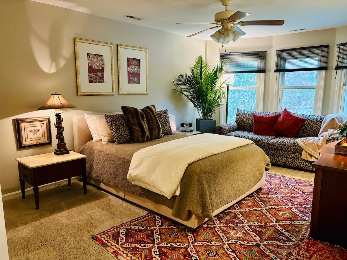 very nice and comfortable master bedroom, mini fridge, coffee station, recliner, shower and bathtub, 2 closets, a welcome basket with water and goodies, parking space available, very well illuminated, ventilated.