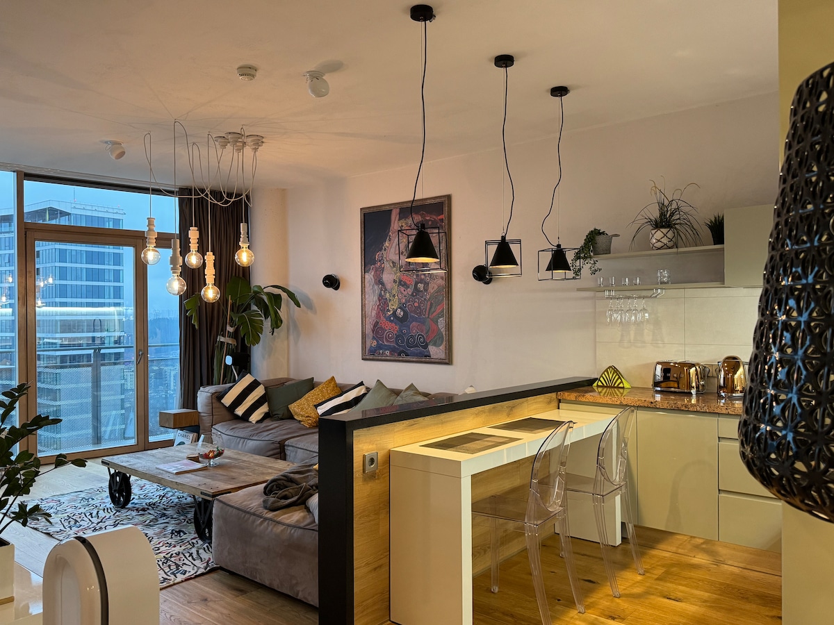 Modern design, On the top 24th floor of a famous skyscraper . Large windows offer amazing views of the city and beyond . The apartment has a lot of facilities,a big bathroom with a massaging jacuzzi, and a high quality home theater system with OLED tv and 12 speakers around. It’s located above a shopping mall, with the Old Town on one side and the new business district on the other, both within walking distance. Perfect for couples, business travelers, and families.