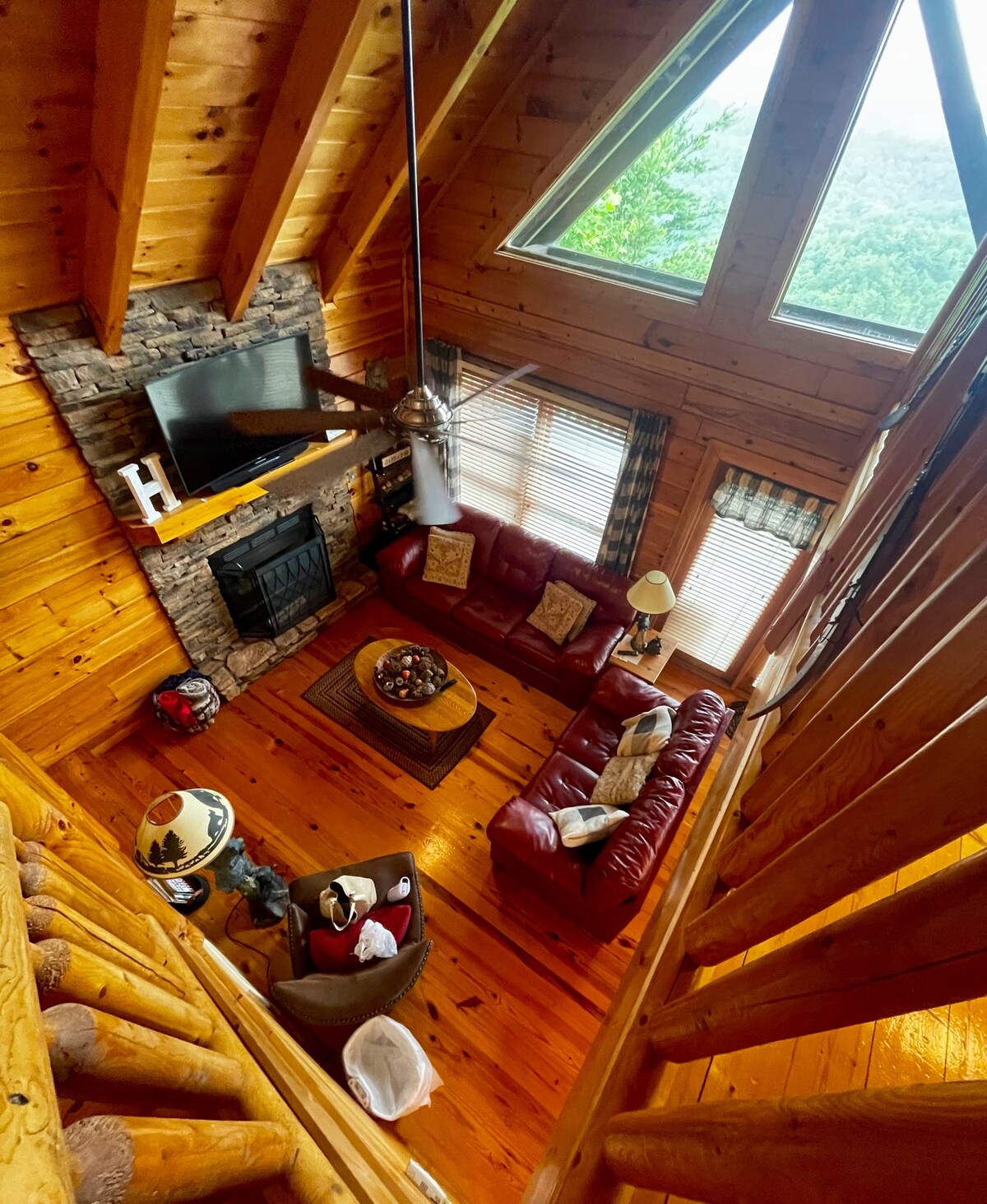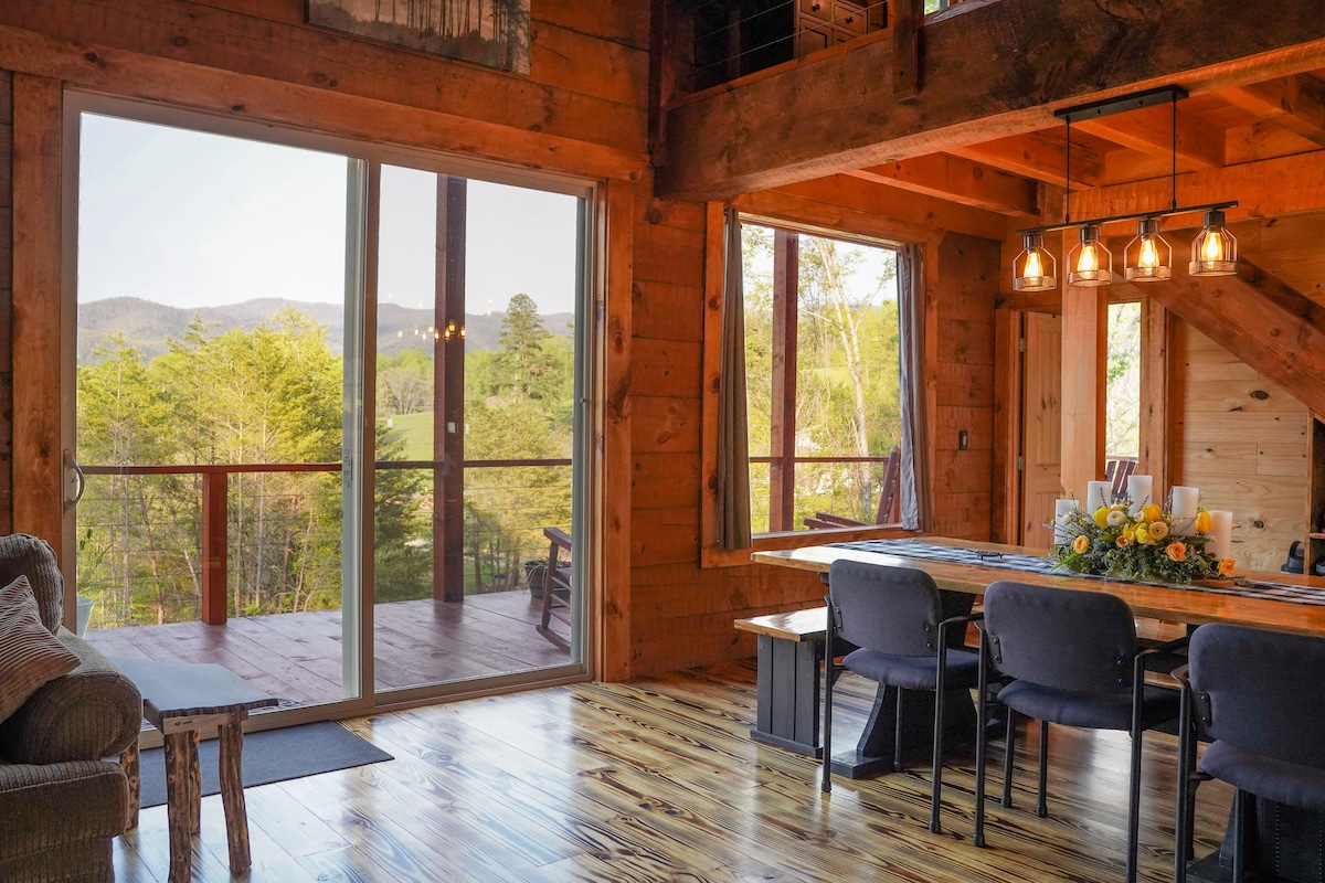 SkyView Lodge is a log cabin built with a view of the Cherokee National and the Smoky Mountain National Forest. Its design maximizes enjoying the incredible views from every room. Ideally located close to white water rafting, zip-lining, hiking, & scenic drives. Within driving distance of the cities of Gatlinburg (35 min), Pigeon Forge (40 min), Tennessee, & Asheville (1 hr) & Hot Springs, NC The Foothills Parkway can be seen from the property. Visit our Youtube channel for a walk through