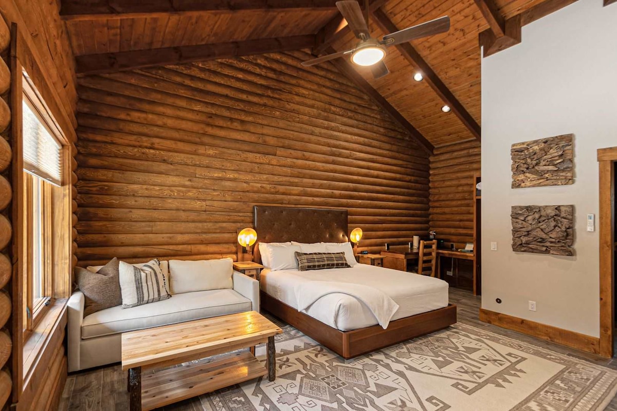 The Timber at Holly Branch's elegant 2-bedroom suite with queen beds is perfect to get the family together. Each suite features our rich fabrics and modern furnishings paired with whole log walls and brass details. We offer a streamlined check-in experience. A personalized door code for your room will be sent to you a few days before your stay, so you can skip the front desk and head straight to your room.