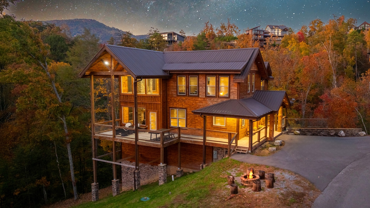 Experience luxury with breathtaking views of the Smoky Mountains. This luxurious property offers expansive vistas of the Great Smoky Mountains National Park right from your home. Featuring a modern cabin design, this house includes a two-story deck with hot tub and an outdoor dining table, gas BBQ grill and fire pit, a game room, two living rooms, and two master bedrooms, each with it's own private ensuite bathroom. The house has beds to comfortably sleep 8.