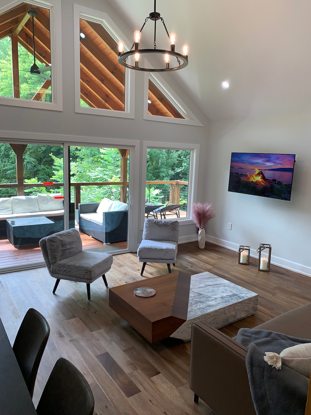 Creekside Chalet is a beautifully remodeled A-frame cabin, originally built in the early 1960s and nestled right in the heart of Gatlinburg. Step into a charming piece of local history that’s been thoughtfully brought back to life with modern comforts and rustic charm. Unwind in the cozy living space with a movie night, soak your cares away in the brand new hot tub, or gather around the fire pit while the sounds of the Smoky Mountains surround you. Make Creekside Chalet your next vacation!