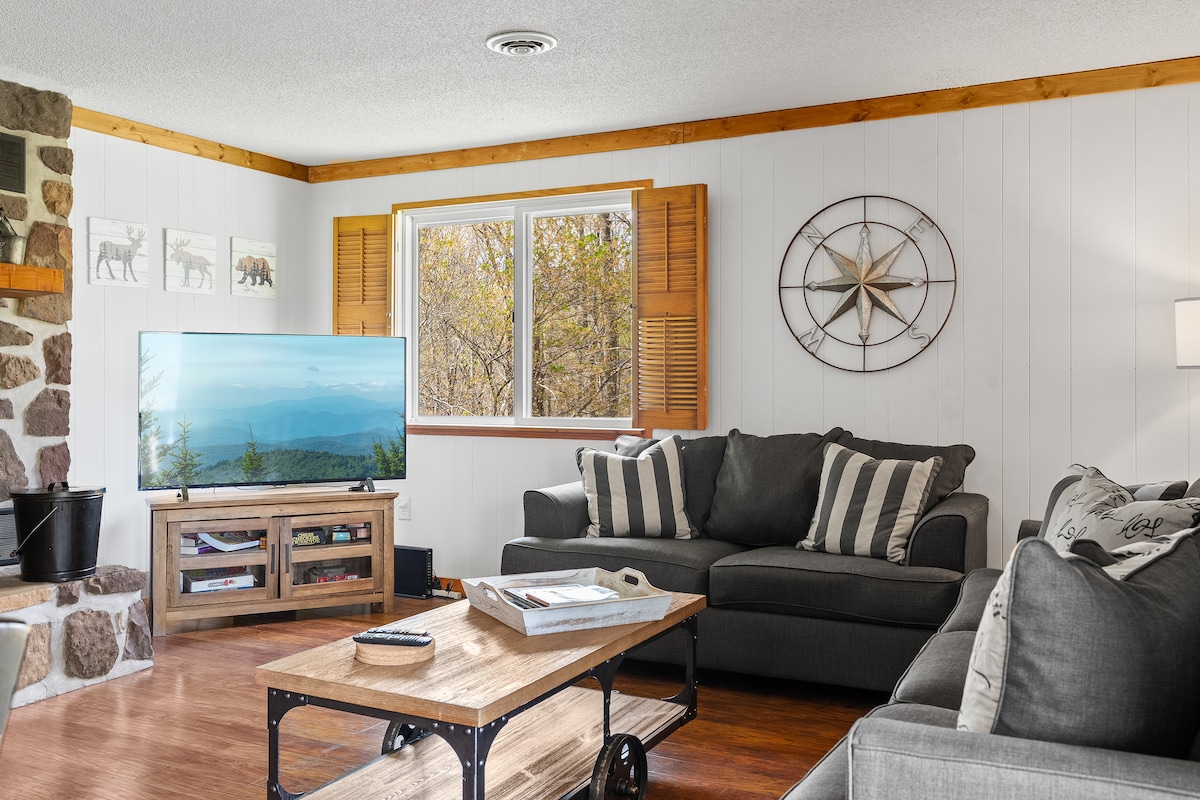 Just admit it, you've always wanted to see the Smokies staying in a space that's totally 1974. Those earth tones, textures and an awesome buck lamp...hey, there's a shag rug! You've found the perfect place to spend the 70s as you ponder wearing bell-bottoms to hike LeConte, "Godfather Part II", Watergate and how the internet might be in 40 years or so. You can think of whatever sitting on the retro deck chairs looking straight at the park. Or dont think at all and dream on the bed.