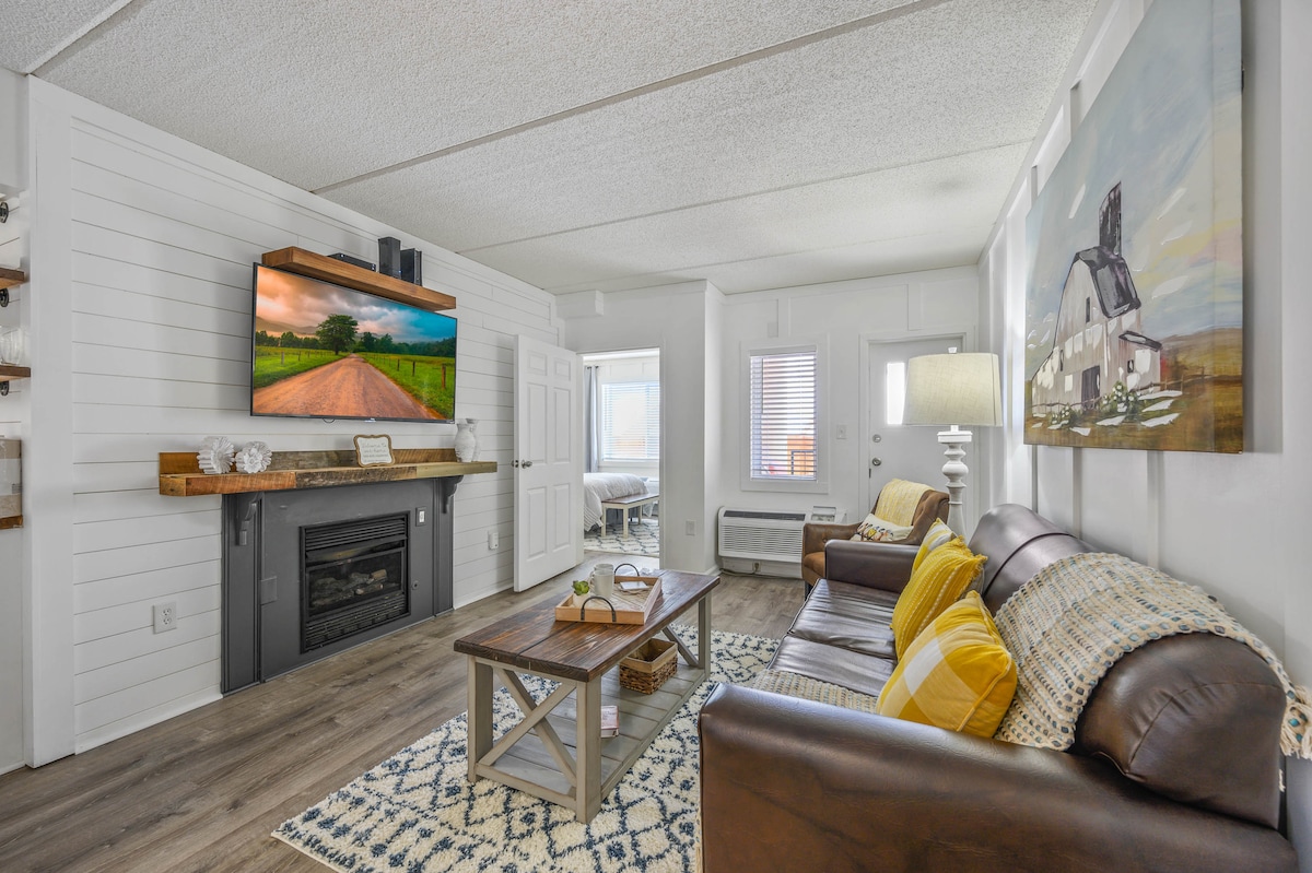 Imagine relaxing in this beautifully decorated, serene mtn retreat offering cozy elegance - yet STILL walking distance to Downtown Gatlinburg? Enjoy our beautifully updated space featuring shiplap and molding throughout, a king bedroom and ensuite bath, kitchenette & cozy living space w/flat panel TV and hi-speed Wi-Fi. Unwind by the fireplace, sip coffee on the private balcony or take a refreshing swim. And walk to vibrant downtown via our "secret" back staircase, saving time and parking fees!