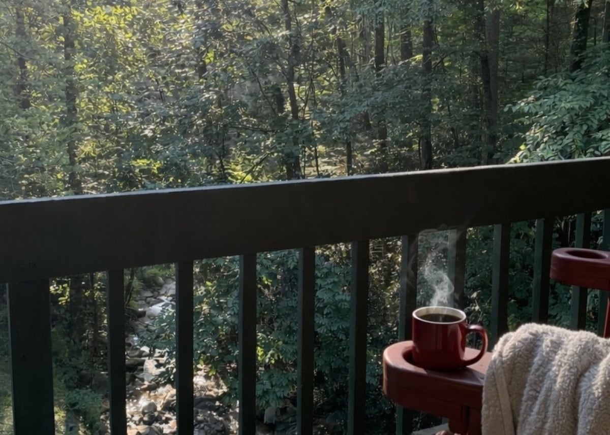 NO PET FEE - It's unique and private! New building codes don't allow you to build right against the river or have cantilevered porches over it as these have. The sound of the water is so relaxing! Come stay in our 2 bedrooms, 1.5 bath condo located in Gatlinburg, TN located right on the river! This condo is one mile from downtown Gatlinburg (to Ripley's Aquarium). Walking distance to many of the main attractions In Gatlinburg.