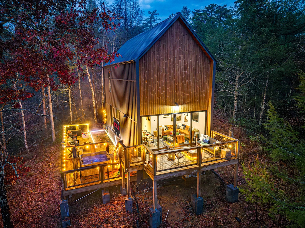 Newly built cabin in the Great Smoky Mountains. With accommodations for up to 12 guests, this unique mountain retreat offers 2 suites, a bonus room, 3 full bathrooms, and 2 half bathrooms. This 2,900 sqft cabin is outfitted with comfortable living and dining areas, fireplace, fully equipped kitchen, game room, theater, patios, balcony, and a spacious deck, where you can gather around the grill, or heated swim spa.