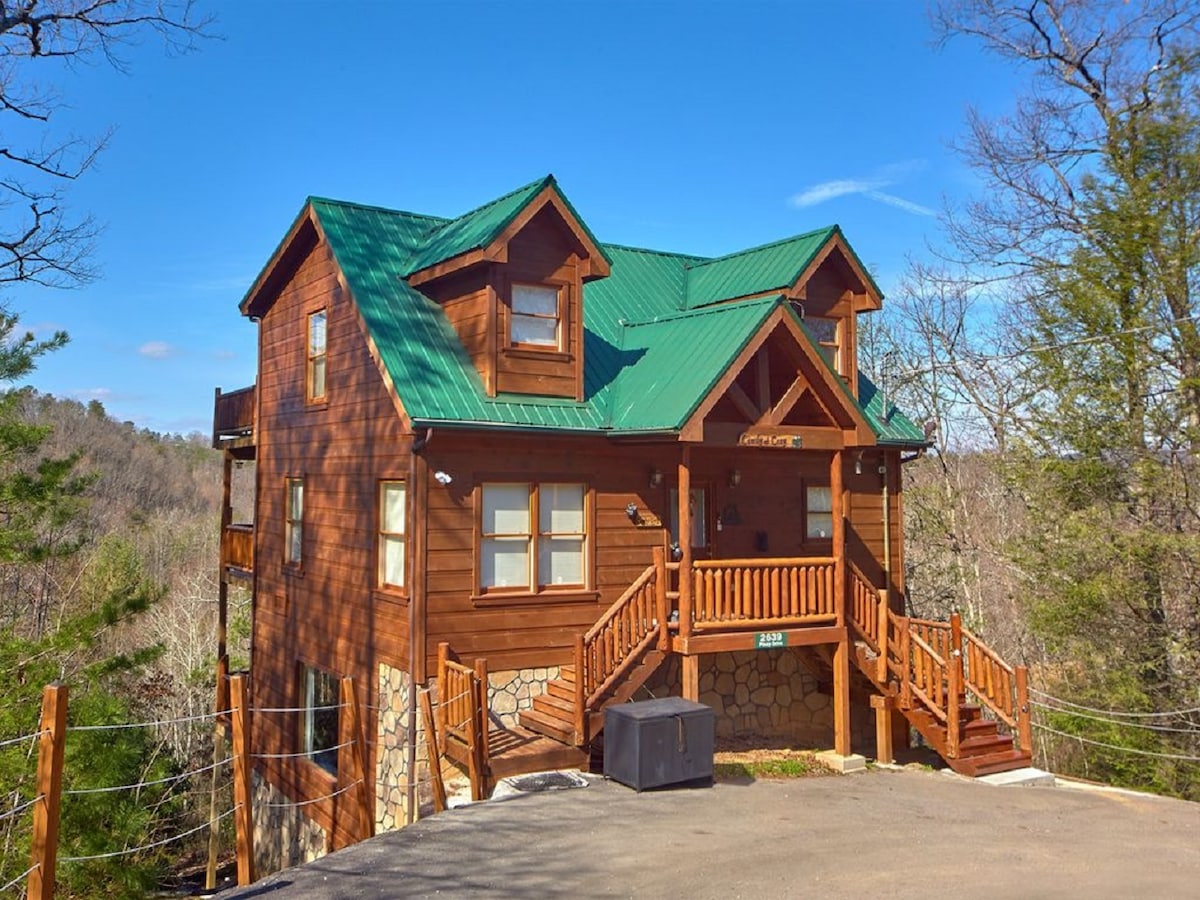 *NEW BUILD Jul 2022, UPGRADED Mar 2026* 3BR/3BA Luxury Log Cabin situated in Chalet Village the most sought-after spot in Gatlinburg. CliffHanger Cabin is perfectly located in the Great Smoky Mountains, just 2.1 mi to Downtown Gatlinburg, 1.1 mi to a Clubhouse Pool, 2.6 mi to Parkway. This stunning cabin features two Identical King Suites on opposite sides of the main floor, each with a Stone Spa-Like Ensuite Bath, a Dual-Head Rain Shower & Soaking Tub. Plus Game Room, Hot Tub, and 3 Fireplaces.