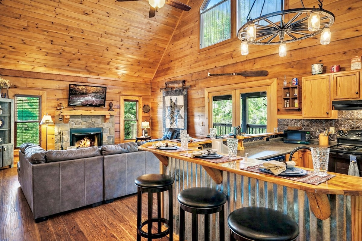 A great honeymoon getaway or relax with a small family of four. Nestled in privacy with a wraparound porch viewing the Great Smoky Mountains. A beautiful 3 level contemporary cabin with game room including a pool table and arcade, 2 fireplaces, upper loft bedroom with its own jacuzzi tub. King and queen size beds and 2.5 bathrooms. The outdoor Hot tub is private and comfortably seats 4. You are just minutes from the Gatlinburg Arts and Craft Community and within 10 minutes to downtown.