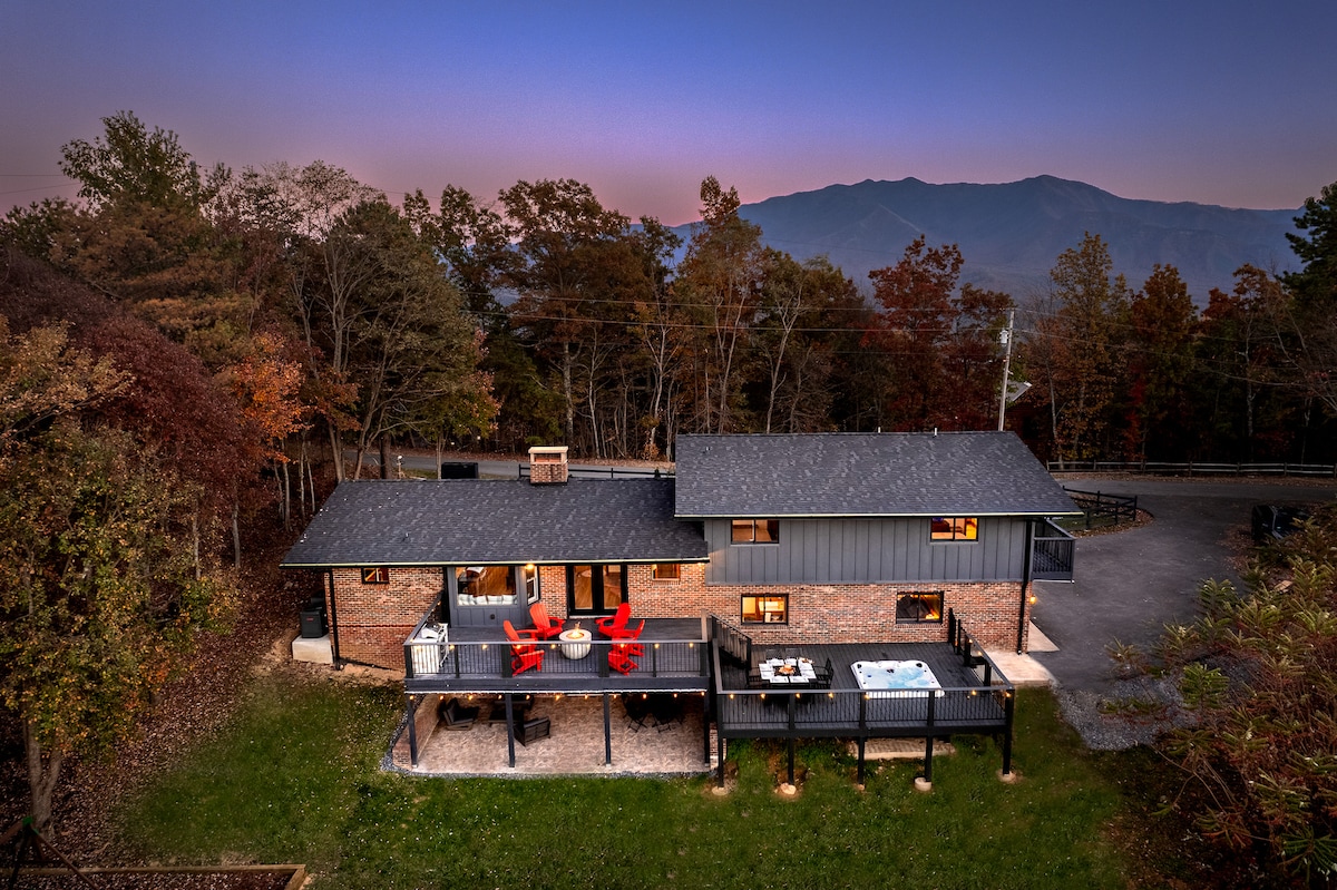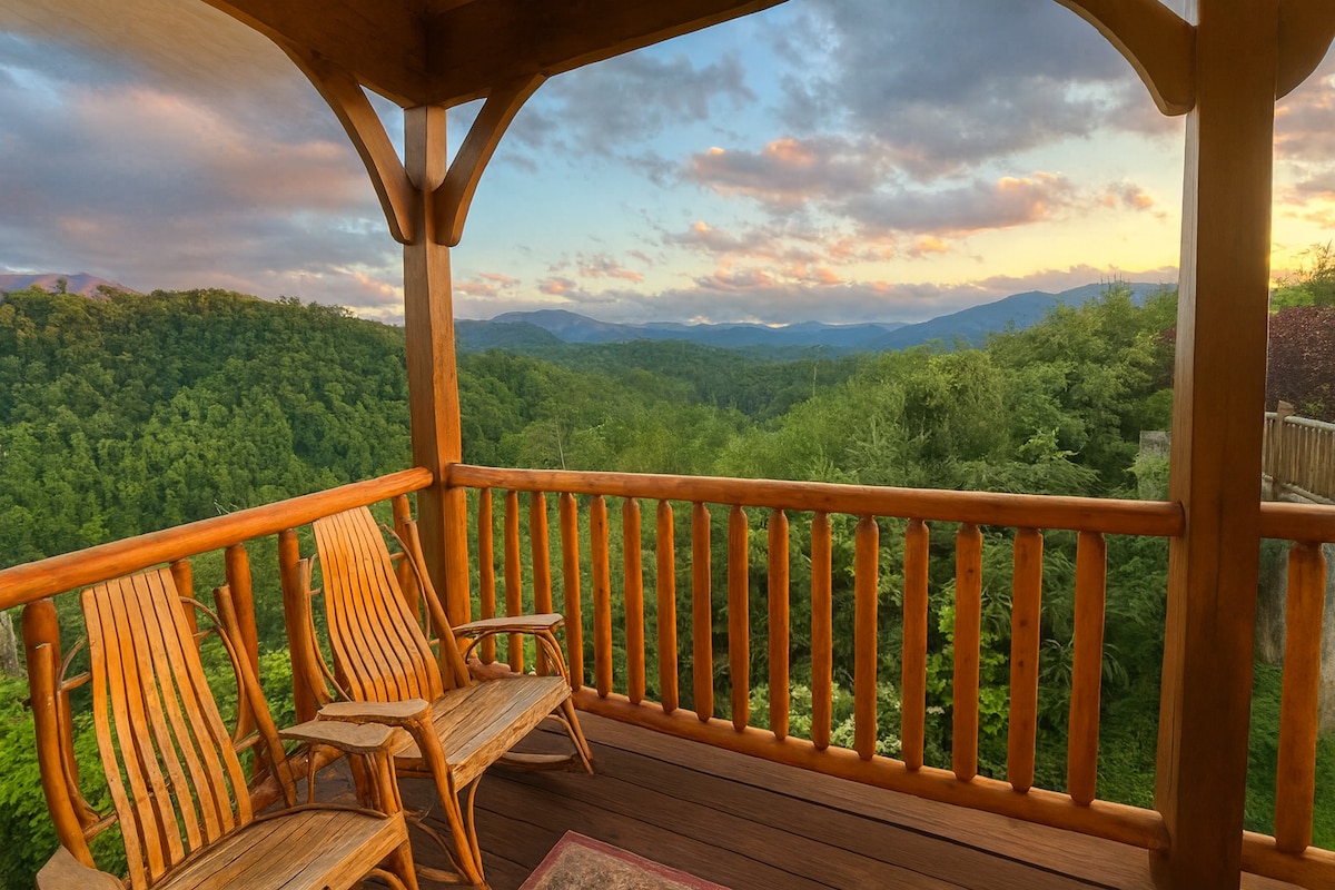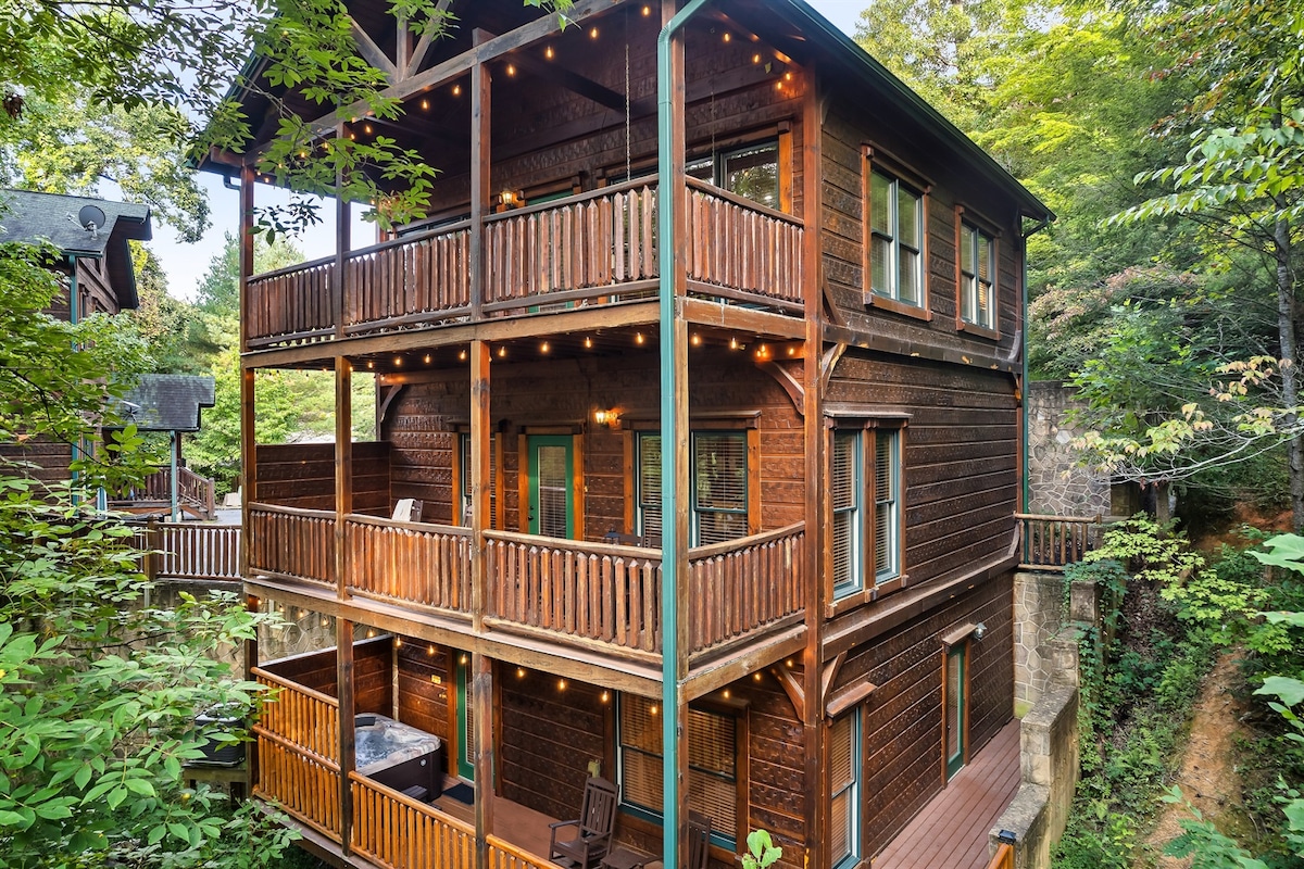 ★Spacious 2500sf cabin +3 decks ★Peaceful, secluded village ★Private Hot Tub on highest deck ★3 King size bed suites ★Hammock+FIRE pit ★ 3 miles to GSMNP entrance ★Movie Theater w/surround sound ★True LOG cabin (squeaky floors) ★24/7 security ★6-kid Bunk room! ★2 fireplaces ★Bears might visit