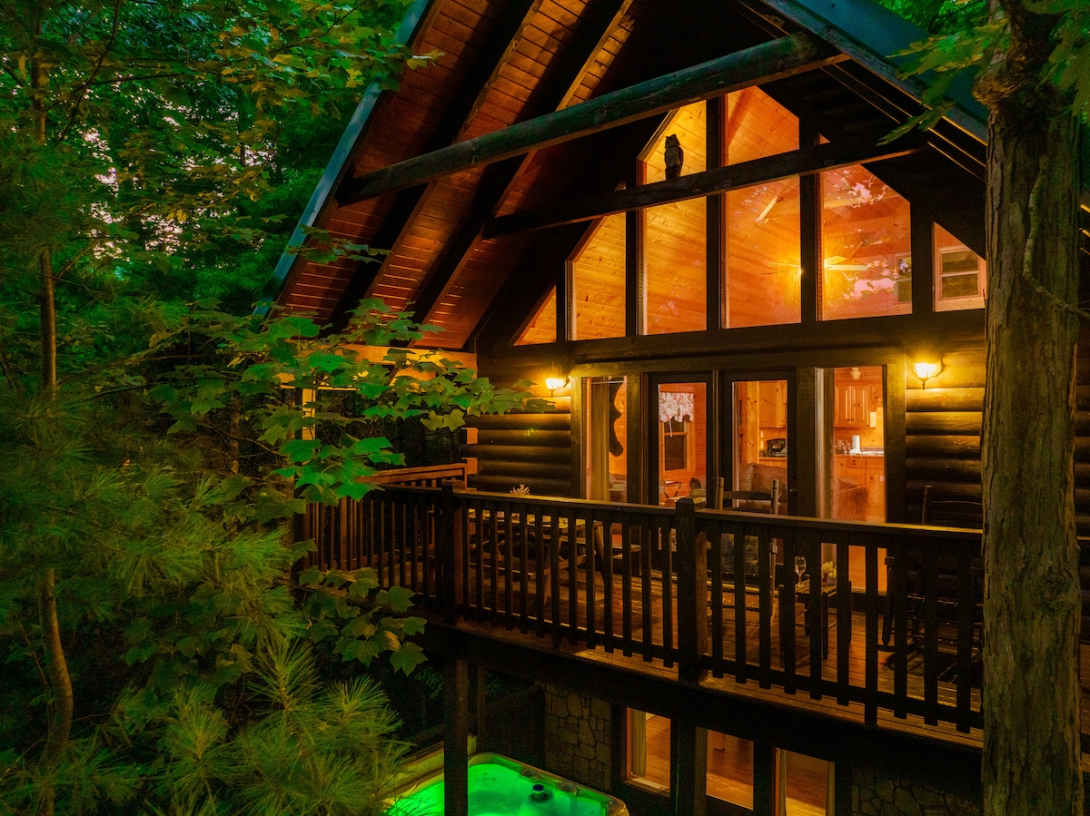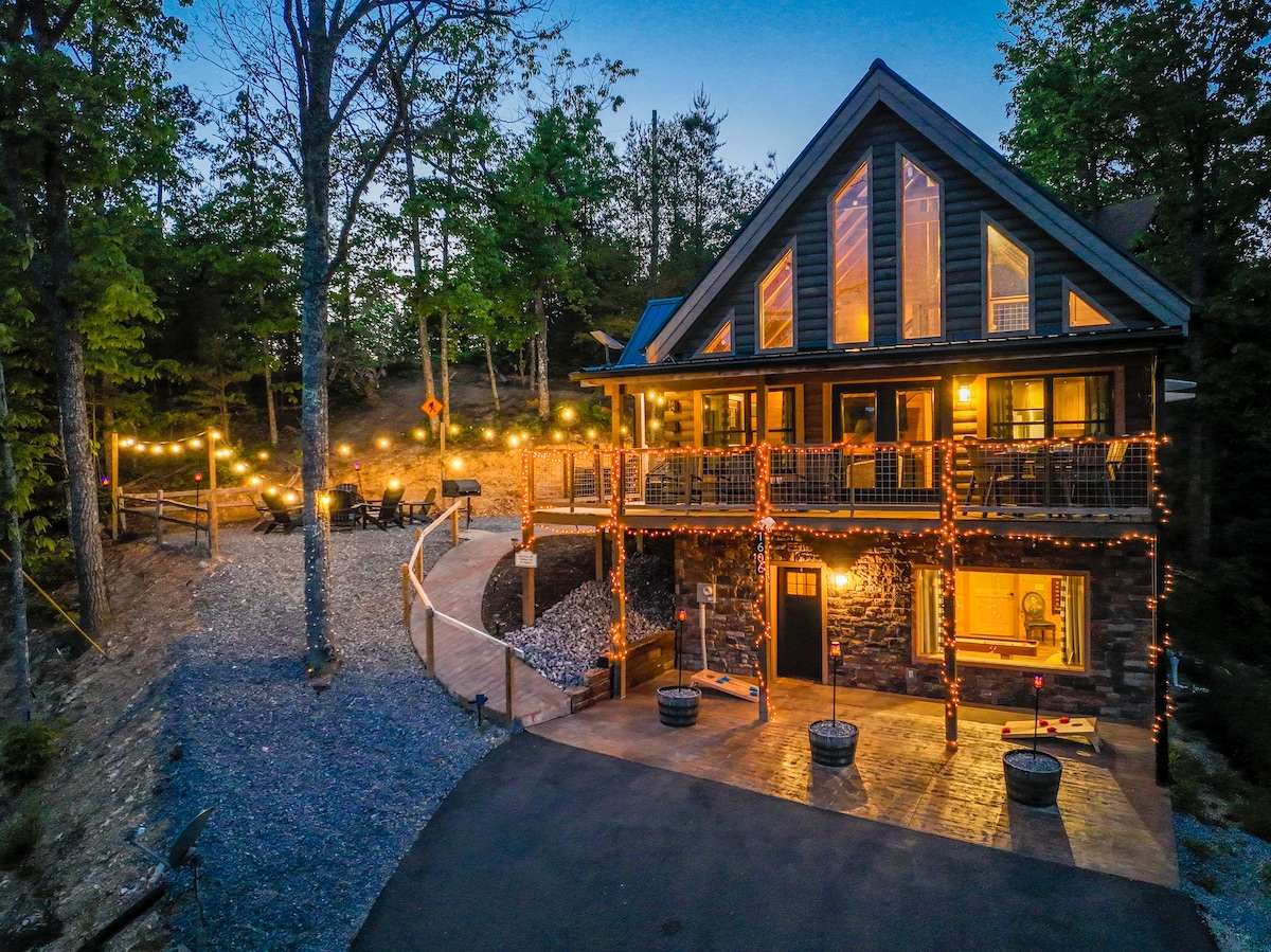 Newly built cabin in the Great Smoky Mountains. With accommodations for up to 12 guests, this unique mountain retreat offers 4 suites, a sleeping loft, 4 full bathrooms, and 3 half bathrooms. This 4,000 sqft cabin is outfitted with a spacious living and dining area, fireplace, fully equipped kitchen, game room, patios, balcony, and a deck, where you can gather around the fire pit, grill, TV, or heated swim spa. With access to Chalet Village Resort: pools, tennis courts, and clubhouses.