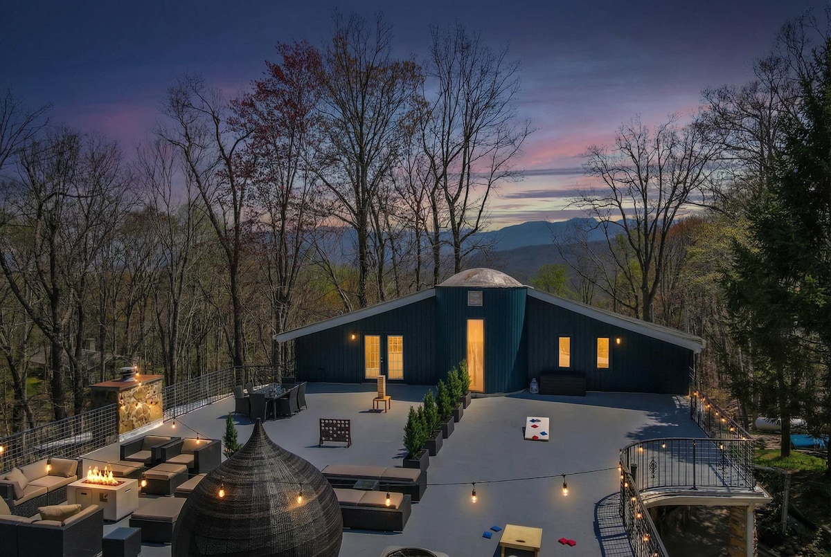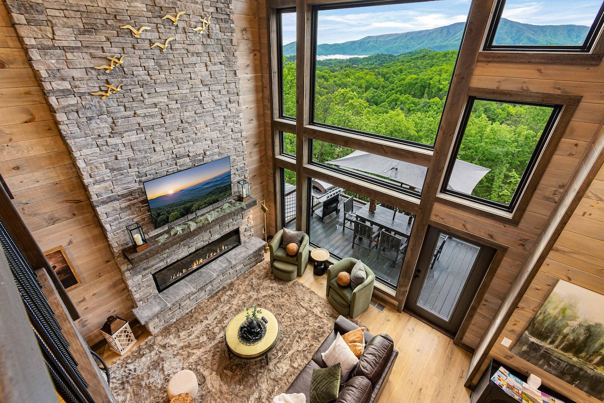 IG/FB/TikTok: SixDiamondsCabins VIEWS!! Only minutes to everything––CUSTOM LUXURY MOUNTAINTOP villa designed by renowned architects. 2+ acres, 5800+ SQFT & many decks/sun room facing Mt LeConte. Brand new 7-person HOT TUB, 100'' projector MOVIE THEATRE, 7 TVs, GAME ROOMS w/ pool, pac-man, ping-pong, golden tee, pinball, buck hunter & cornhole, Harry Potter dungeon, bluetooth music, 3 FIREPITS/FIREPLACES, comfy beds, high-speed WiFi, parking, & easy roads.