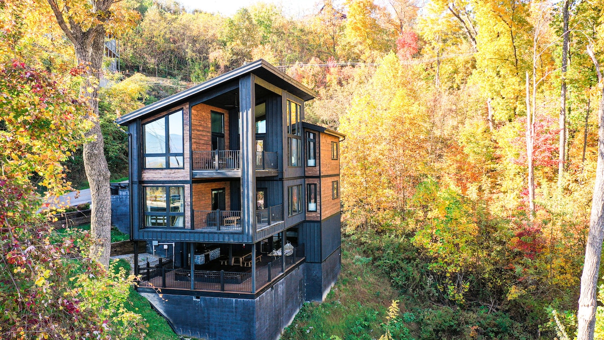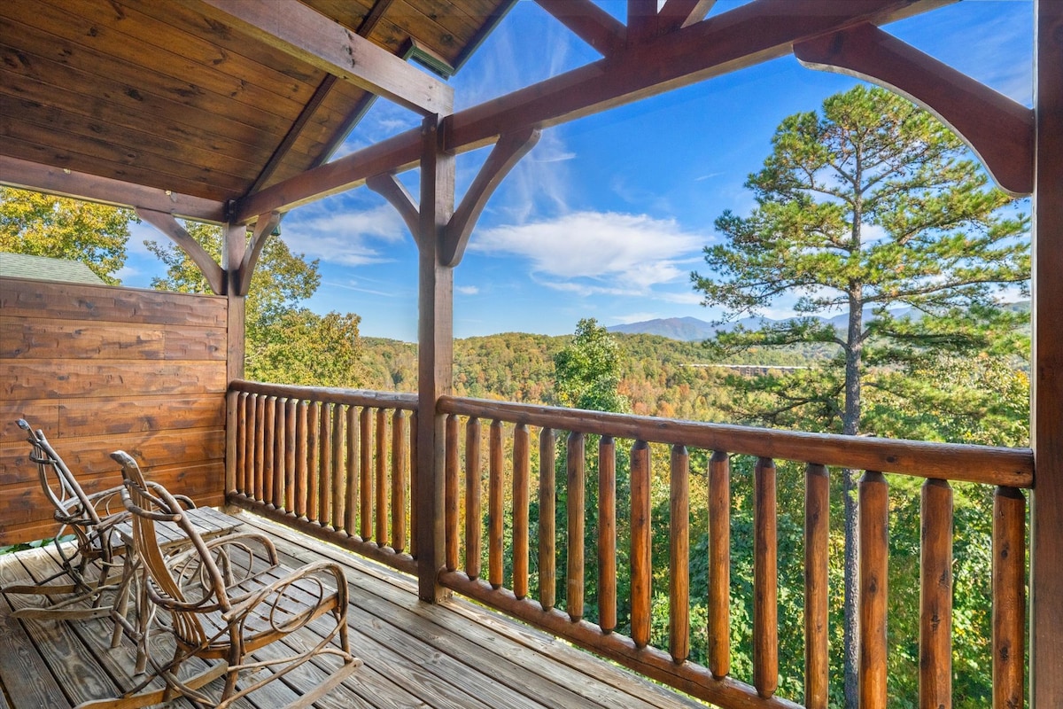 Experience BREATHTAKING mountain views from your own private slice of the Smokies! ★Honeycomb Retreat★ is a 5 star-rated modern-rustic style cabin located one of the most sought-after cabin resorts. ★ STUNNING Panoramic Views! ★ New Hot Tub ★ New Furnishings, Linen + High Quality Mattresses ★ King Suite + En Suite Whirlpool Tub ★ Pool, Fitness Area + Cantina (seasonal) ★ 400 mbps hi speed Wi-Fi ★ 7 mi Dollywood ★ 6 mi PF ★ 10 mi G-burg ★ 11 mi GSMNP