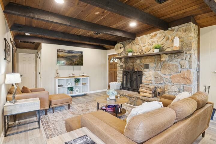Welcome to 🦌 Scandi House 🦌 Unwind in the beautiful Smoky Mountains while enjoying the modern design, privacy, and the amenities of this Scandinavian inspired cabin. This cabin was newly built in 2024 and has been updated in December 2025. We completed a deck extension with outdoor theater, bocce/bowling, firepits, seating, and games. Inside we upgraded the design, added a 6 person dining table, new furniture, bunk game area, and main bedroom king bed, second coffee bar, and reading nook.