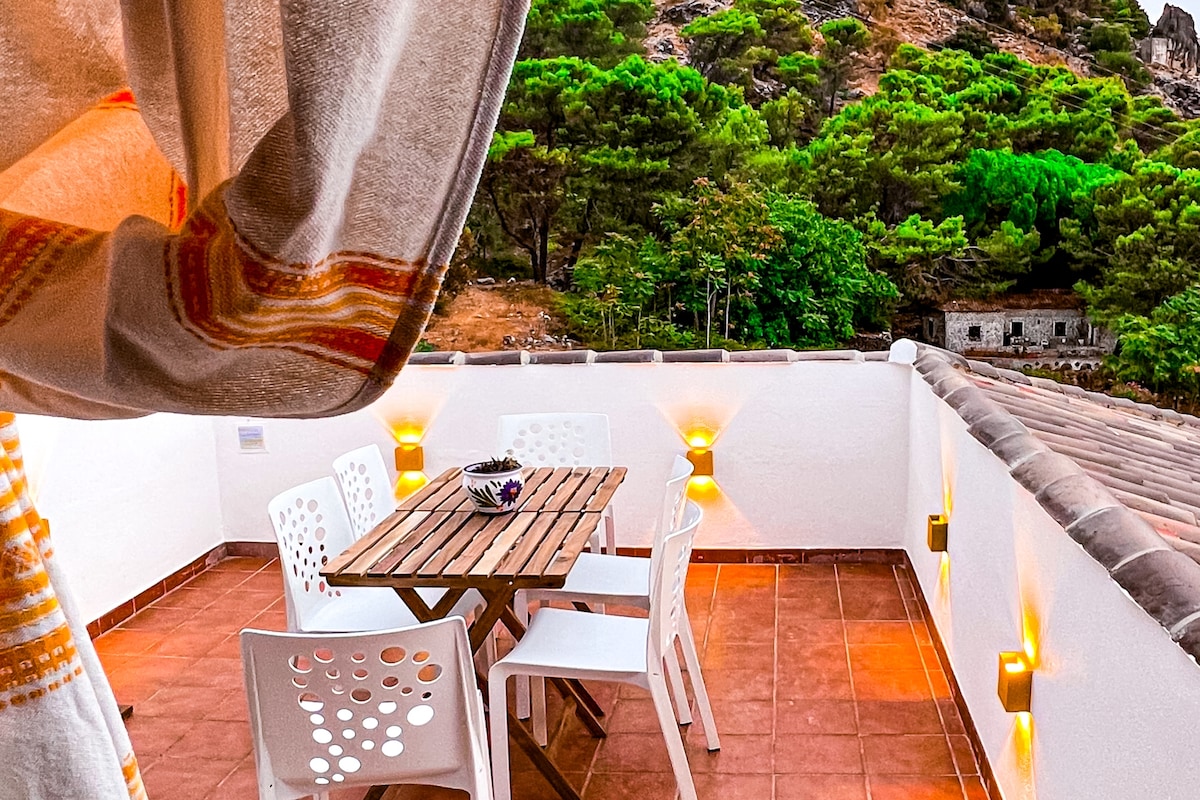 CALMA, TRANQUILIDAD Y NATURALEZA Una acogedora casita de piedra, cal y madera. Rescatada del pasado para que puedas disfrutarla y vivir unos días llenos de paz y tranquilidad. Con espacio para dos personas, cuenta con un salón con chimenea, comedor y cocina completamente equipada en la primera planta. La habitación y el baño, ubicados en una preciosa buhardilla, conduce a una terraza desde donde podrás disfrutar de unas increíbles vistas del Valle del Genal.