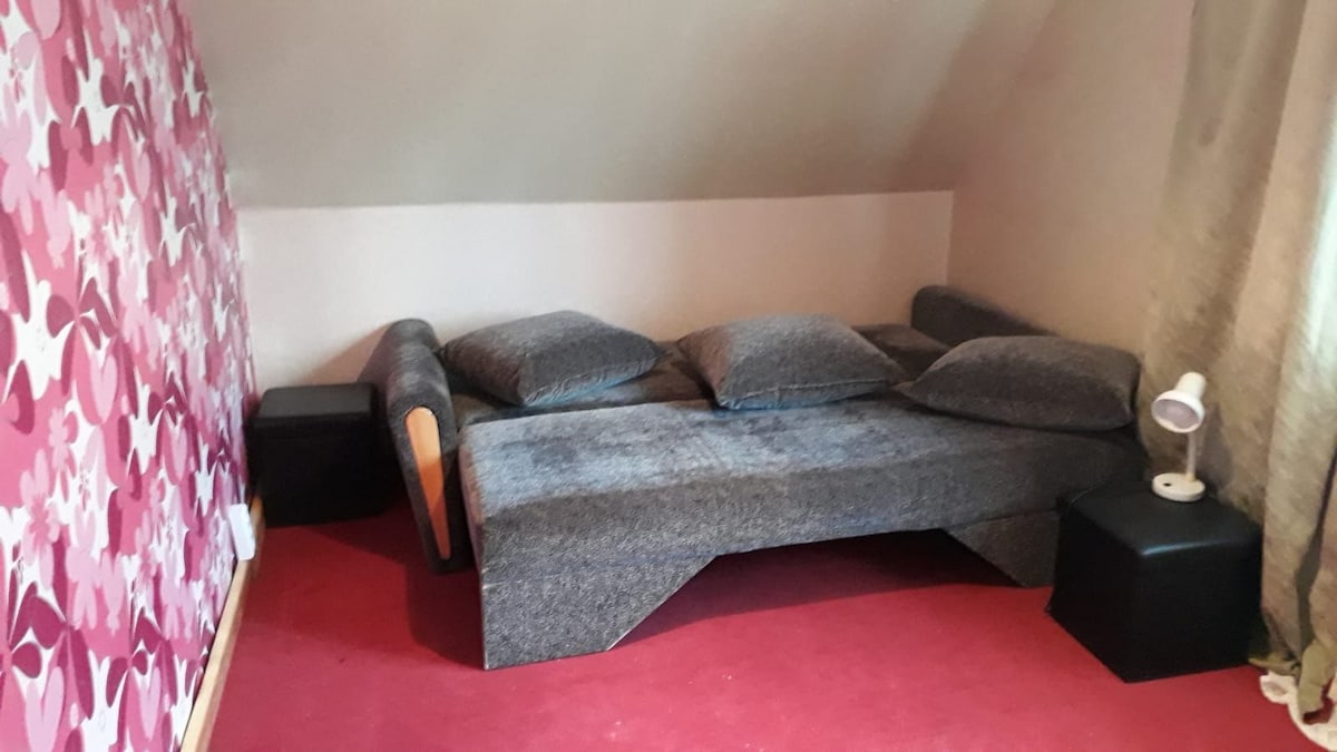 A spacious studio-type guest house with a balcony and sauna located in a quiet private house neighborhood for 2 adults (+ a child/teenager). A studio type open living space upstairs; wc,shower and sauna downstairs. Has large windows and a balcony facing trees and a yard. A cooker, fridge, fire place, wi-fi, free parking; a washing machine. 1200 m to the city center & cafes. 700 m to walking trails along the river. Communication in Latvian and fluent English A dog and a cat may be in the yard.