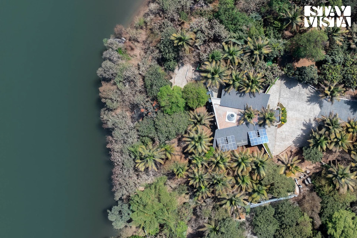 Reconnect with nature at this unforgettable escape surrounded by tall trees. Relax and unwind in a beautiful bungalow with great aesthetics designed keeping in mind comfort for families and couples. The bungalow is private and peaceful offering stunning views of the Sahyadri range. With calming nature walks in a sprawling over 7 acres of the property and a private access to the Ulhas river, this farm stay will surely make your stay a memorable one.