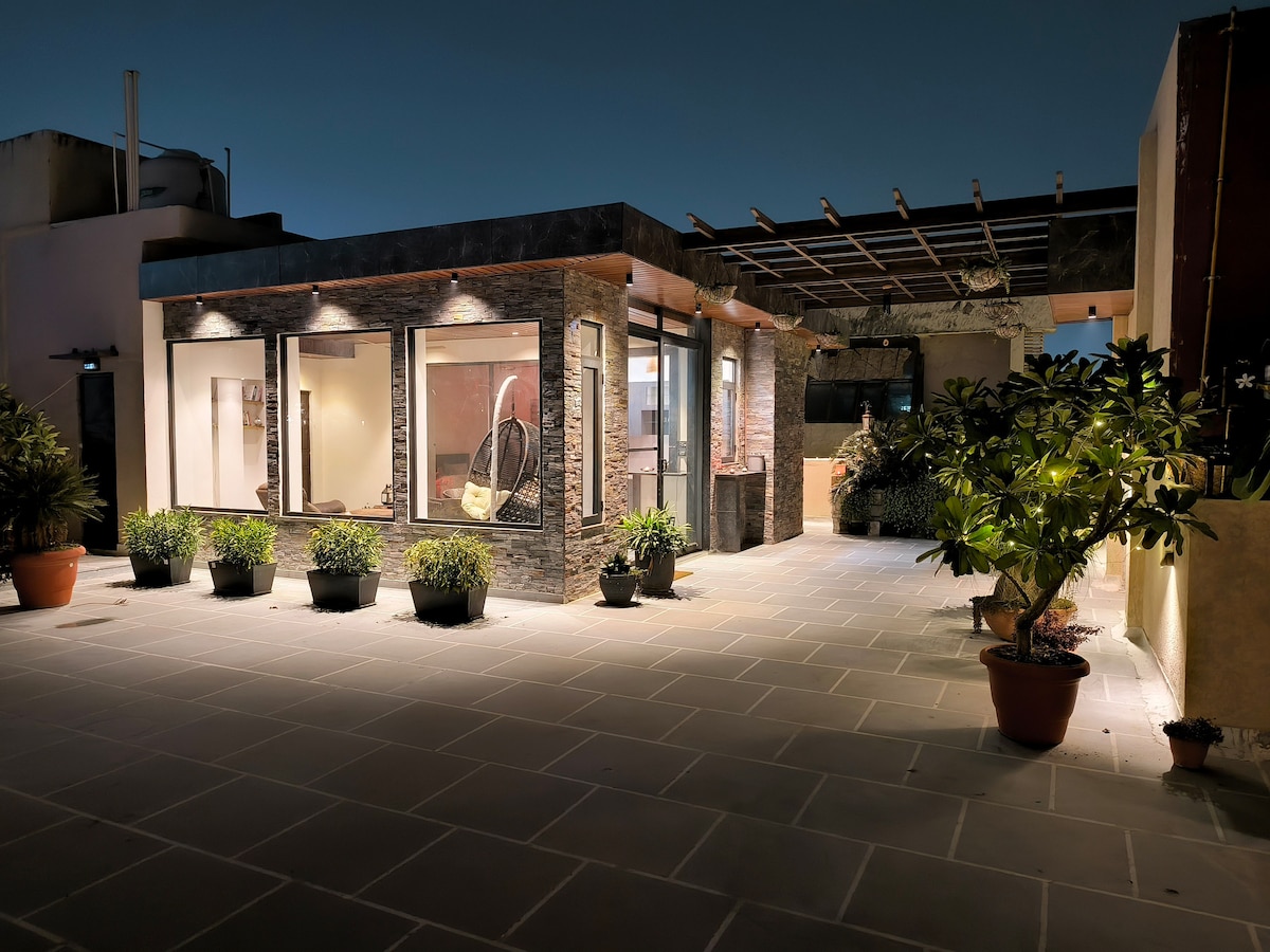 • H13/ HEPA Room Air Purifiers • Daily Cleaning & Fresh Towels • Caretaker from 10:30AM - 7PM • Smart TV w/ Netflix, Amazon Prime etc. • High Speed Internet Wi-Fi • 5-7 mins from Mehrauli Fashion Street (Best Nightlife in Delhi) & Saket Citywalk Mall • 5 mins from Delhi Metro Welcome to onnyxrooftop I have curated a luxury experience getaway in South Delhi, Central NCR. Enjoy an amazing time with Luxurious Bedrooms, Exquisite Living Room, and Private Rooftop Pergola Lounge with Hot Tub & Bar.