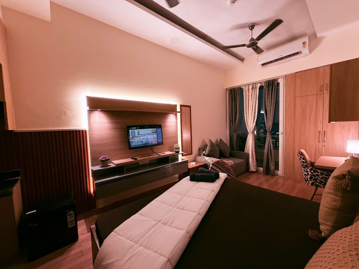 Fully furnished luxurious studio apartment with all modern amenities available in Greater Noida near Metro station. Luxurious , Specious and Couple friendly studio in Greater Noida Near Expo Mart. What You’ll Love: ✔ Unique Interior – Enjoy the Mesmerizing Interior. ✔ Modern Comfort – A beautifully furnished space with a comfy bed, cozy seating, and stylish decor. ✔ Fully Equipped Kitchen – Cook your favorite meals with ease. ✔ Fast WiFi & Smart TV – Stay connected and entertained.