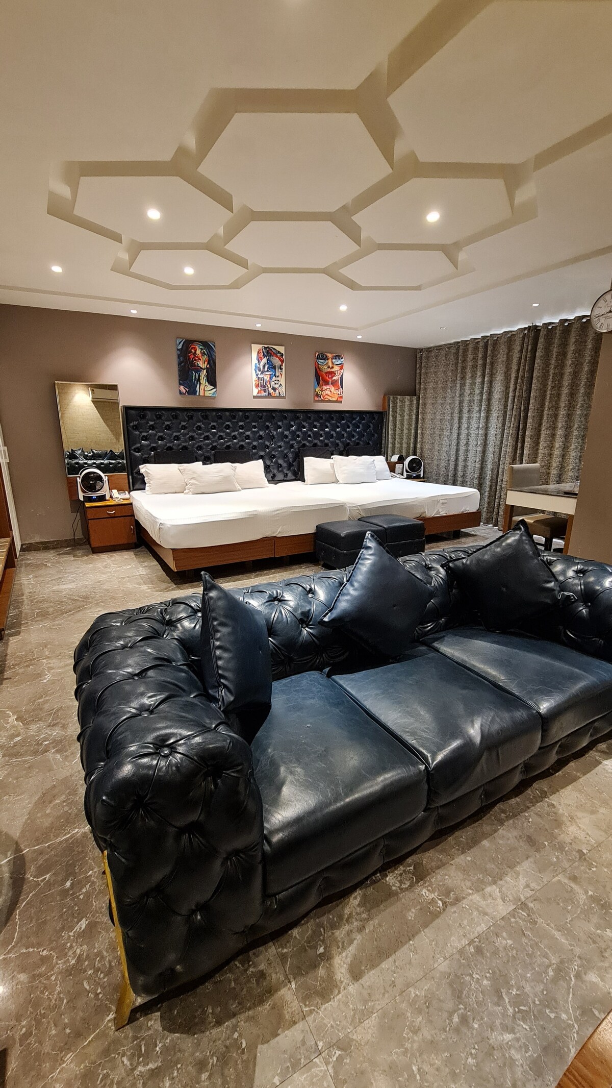 Its a Suite Room in a Boutique Hotel Royal Castle Grand C R Park. Interesting Features : -6 Feet Long Bed - 1Sofa cum Bed -65" Led Tv -500 Litres Refrigerator - 8 Sofa Seating Great for a family.