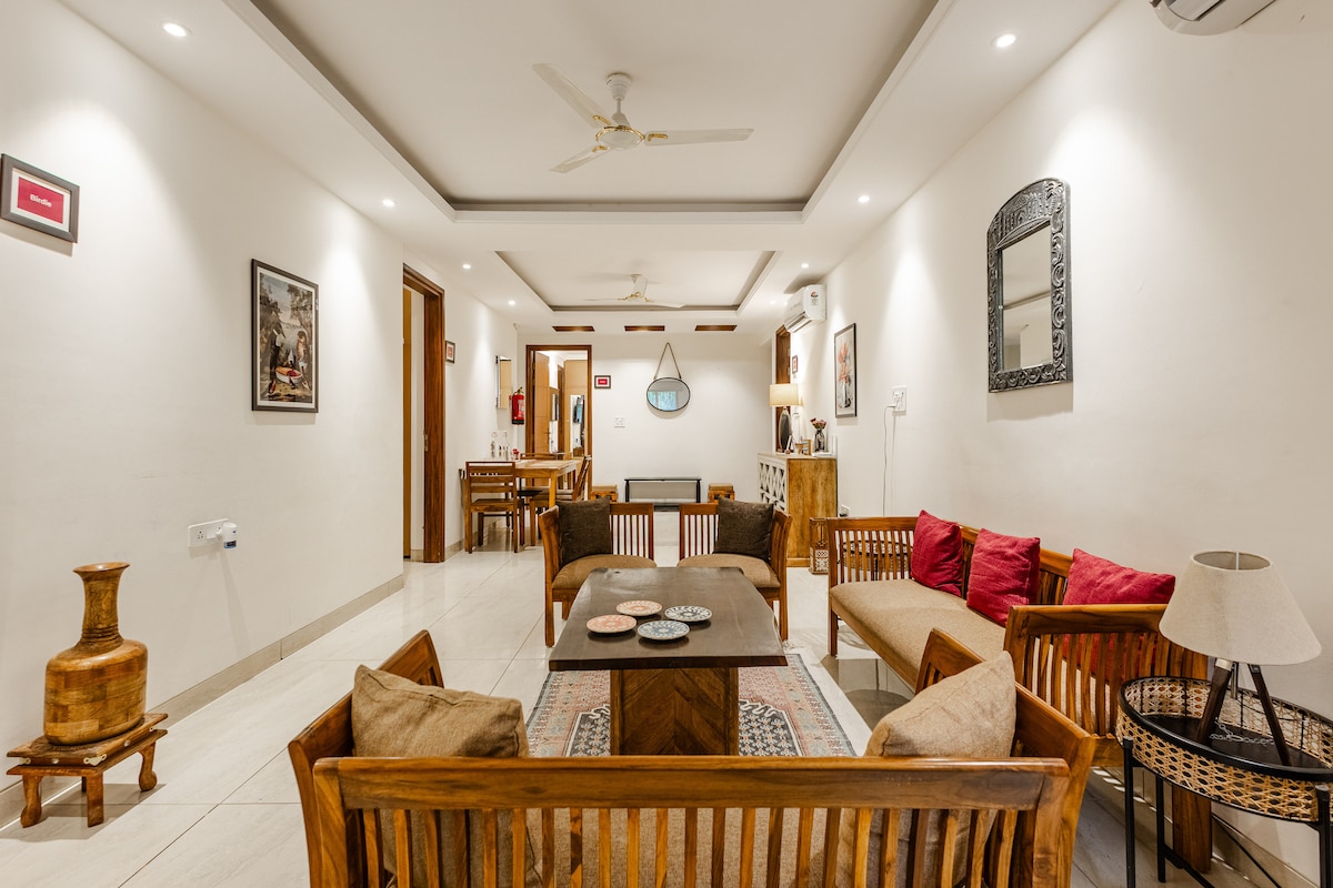 Welcome to Golfgreens: Sunny and spacious, ground-floor, 4-bedroom airbnb in the heart of South Delhi. Located minutes from PVR Saket, Malviya Nagar Metro Station, Select City / DLF Avenue and Max. 4 luxurious bedrooms with king sized beds, attached baths, AC/heating & air purifiers. A spacious & sunlit open-style living area, fully equipped kitchen with indoor + outdoor dining spaces. And a beautiful serene garden. Your personal oasis in the city.