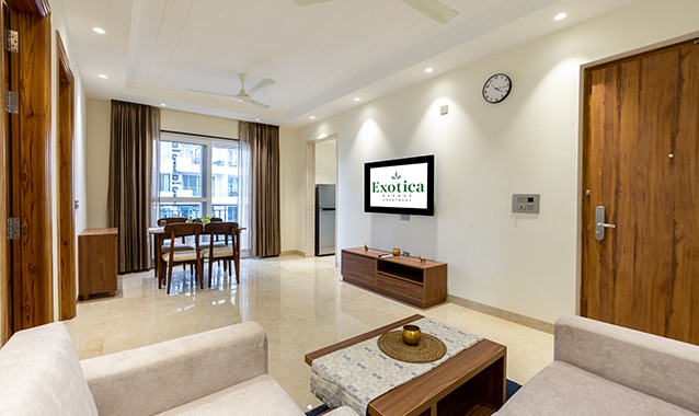 Welcome to Fusion Comfort, a thoughtfully designed 2-BHK apartment with a calming aesthetic, offering a perfect blend of privacy and city convenience, everything you need to feel at home. Highlights: 3 ACs | 2 queen beds | work table | washing machine | refrigerator | fully equipped kitchen | 2 bathrooms | 3 balconies with planters | 5 seater sofa | smart TV with OTT | home theatre | garment steamer | bedsheets & blankets | parking space | close to malls, cafes, markets, cinema & hospitals