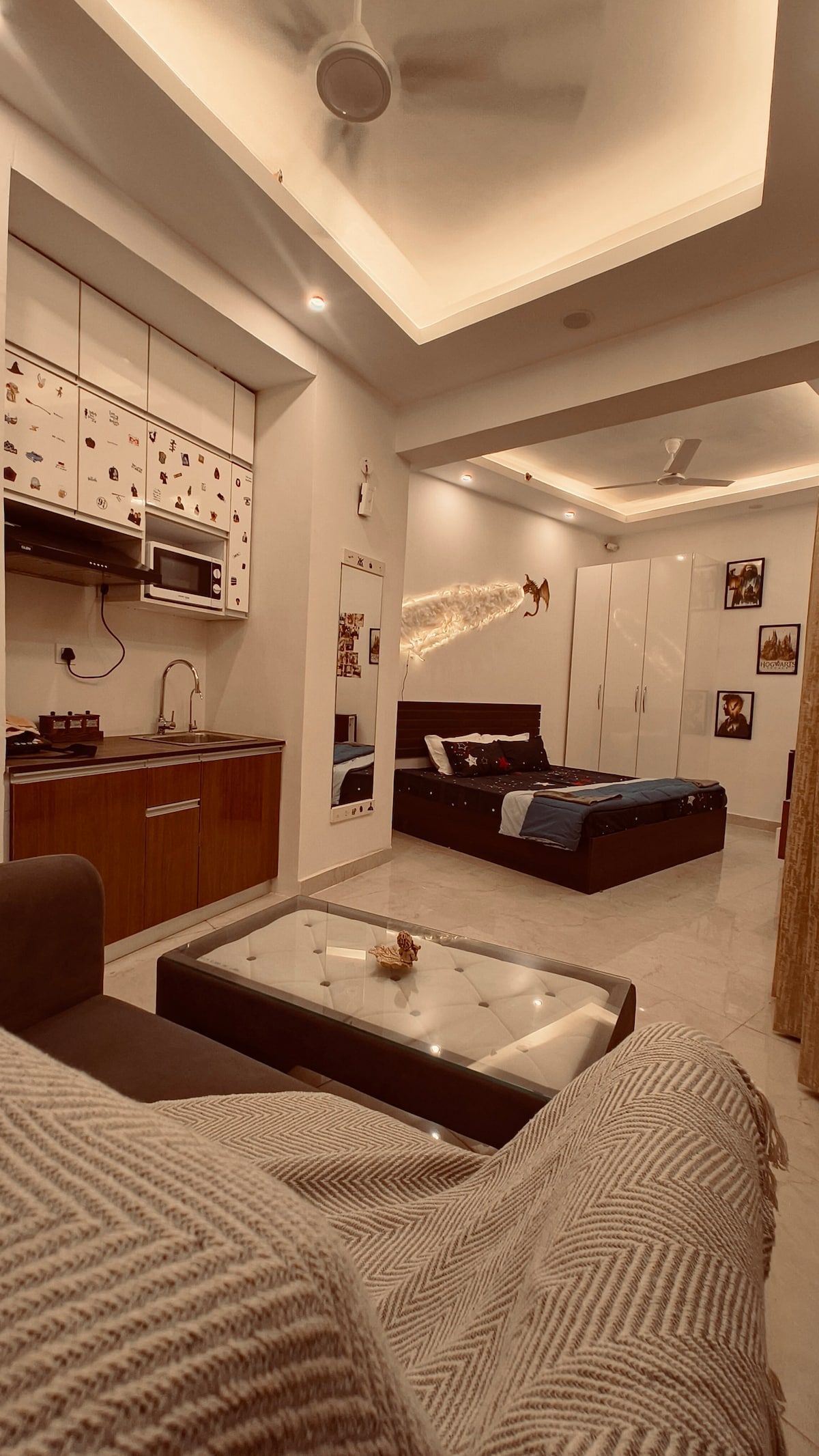 Welcome to our luxurious urban Studio, a sanctuary of style and sophistication in the vibrant heart of the Gurgaon. A standout feature of our loft is specialty Black color scheme, which adds a touch of elegance and drama to space, making your stay comfortable & stunning. As you step into our elegantly furnished Studio, you’ll be greeted by sight of our plush black recliners. These two luxurious recliners are the centerpiece, offering a perfect blend of contemporary design & exceptional comfort.