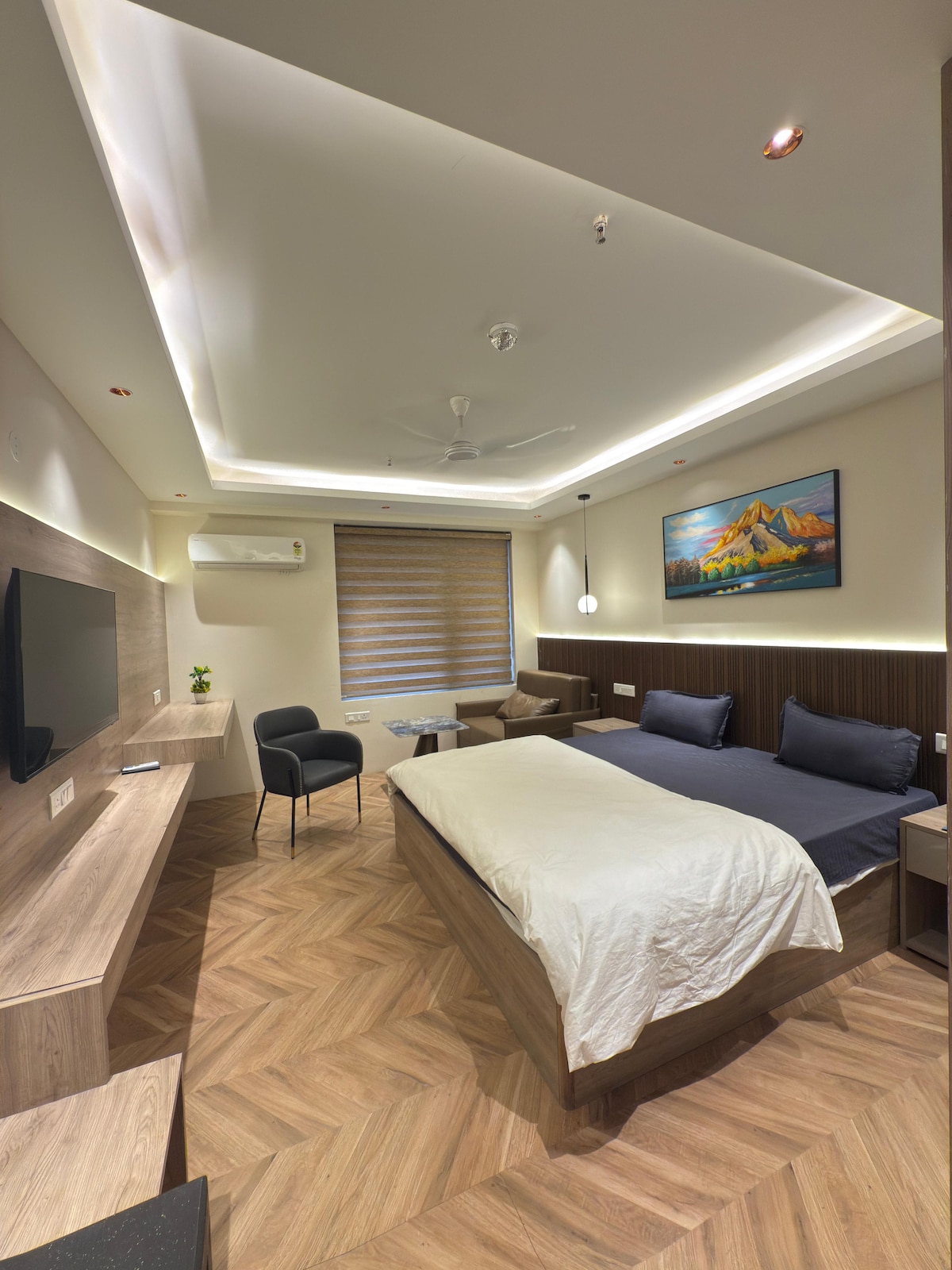 Welcome to our luxurious urban Studio, a sanctuary of style and sophistication in the vibrant heart of the Gurgaon. A standout feature of our loft is specialty Black color scheme, which adds a touch of elegance and drama to space, making your stay comfortable & stunning. As you step into our elegantly furnished Studio, you’ll be greeted by sight of our plush black recliners. These two luxurious recliners are the centerpiece, offering a perfect blend of contemporary design & exceptional comfort.