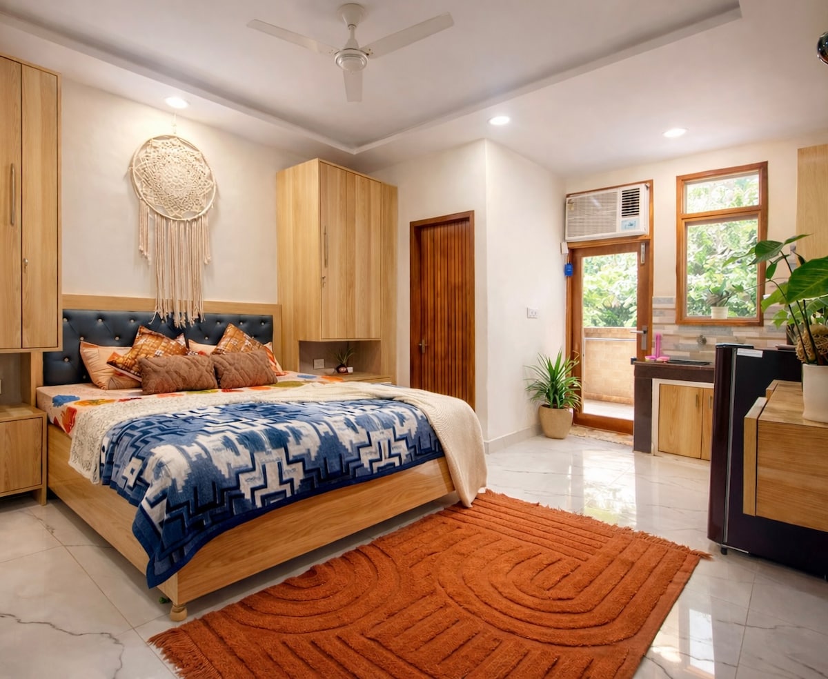 Your Stylish 2BHK in South Delhi Welcome to our beautiful 2-bedroom apartment, this corner gem is perfectly located in the heart of Lajpat Nagar, South Delhi. It is surrounded by lush green parks on 3 sides. Enjoy fully air-conditioned rooms, a well-equipped kitchen with utensils, LED TV, geysers for hot water, and even an elevator for hassle-free access. Its just a 2-minute walk from Lajpat Nagar market, where you’ll find shopping, food, etc. Only 4 minutes from the Lajpat Nagar Metro Station.