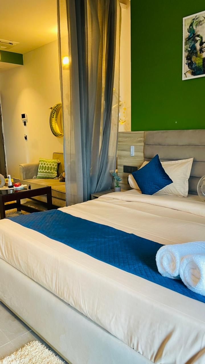 Modern 1BHK in Central Park Flower Valley. Sunlight fills the bedroom with a king bed and calm interiors. The balcony is a little wild, making it perfect for fresh air, chai, or a smoke under open sky. Kitchen is fully set for basic cooking. Smart TV, Wi-Fi , AC + inverter backup keep you comfortable. Great for business trips, short stays or slow weekends. A peaceful pocket of soft luxury in Gurugram. Soft daylight in every corner feels designed to breathe with a beautiful Aesthetic pool View.
