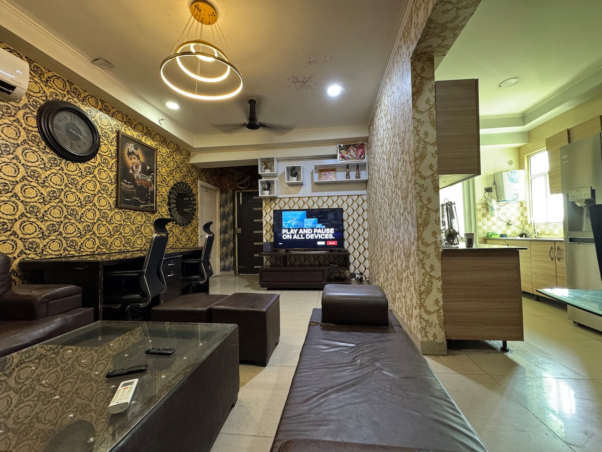 Kick back & relax in this calm & luxurious studio with the warmth of home & the vibe of a high-end hotel. Furnished with a plush King-size bed & modern décor. Amenities: 24/7 Grocery Store Modern Kitchenette High-Speed WiFi & TV Secure Parking outside tower but 24/7 Secured The first 2 floors has commercial shops, offering: Laundry Services Salon Café Medical Store Easy access to the India Expo Mart, Buddh International Circuit. Perfect for couples, solo travellers, or business partners.