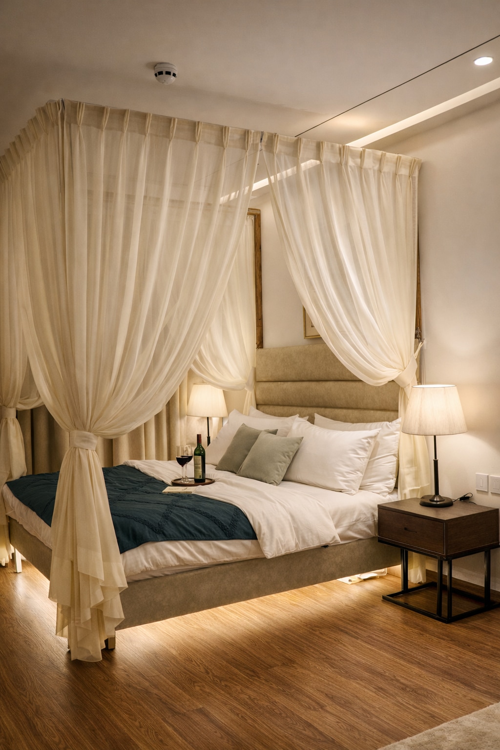Welcome to NOIR Haus – your elevated escape above the city. Step into a dreamy canopy bed wrapped in soft sheers, glowing under warm ambient lighting that sets a calm, intimate tone. This modern boutique suite on the 12th floor blends cozy textures with refined finishes, creating a space that feels stylish yet inviting. Enjoy breathtaking skyline views where golden sunsets fade into sparkling city lights. Whether unwinding after a long day or savouring a slow morning above the city.