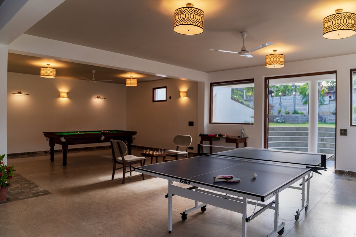 ◆ 4-bedroom villa featuring two living rooms and a stylish loft bed. ◆ Nearby Attractions: ✔ Aravali Biodiversity Park – 2.0 KM ✔ Ambience Mall – 6.8 KM ✔ Cyber Hub – 7 KM ✔ Indira Gandhi International Airport – 16.6 KM ◆ Enjoy movie nights in the home theater with comfy seating, AC, large screen & immersive sound. ◆ Gaming room with a pool table & bar counter – perfect for fun evenings. ◆ Terrace with city views – ideal for relaxing sunsets.
