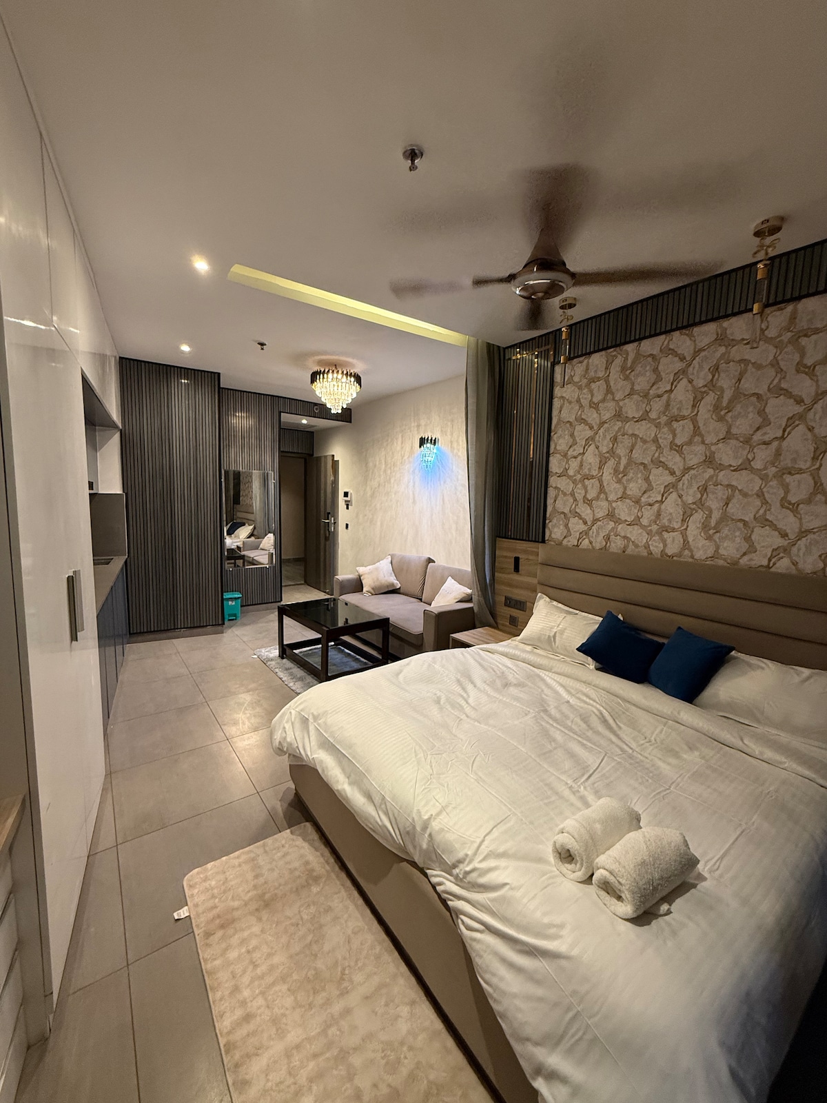 Welcome to this another beautiful and cozy property by Tulip Homes. It is situated on 16th floor & completely fresh apartment with garden patio which makes it unique in class. The place is perfect for relaxing and enjoying scenic view of modern architecture. Apartment is loaded with smart tv (all applications works), big mirror wall, a cozy double bed, big wardrobe with locker, 5 seater sofa, stylish nesting coffee tables, fridge, microwave, induction, electric kettle, toaster, iron & much more