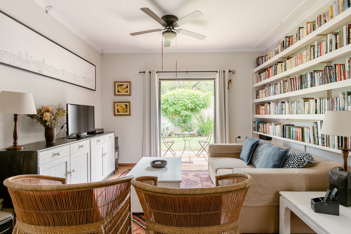 Our studio is close to Rosebank, less than a five minute walk from Craighall Park shops and restaurants and a short drive to the hub of Parkhurst. Centrally located within a pretty courtyard, it is quiet and whilst attached to the main house, has its own entrance and secure parking. Guests have a private outside space with a table and chairs overlooking the flowers where they can relax and enjoy some fresh air. The studio is not suitable for children, babies or those with limited mobility.