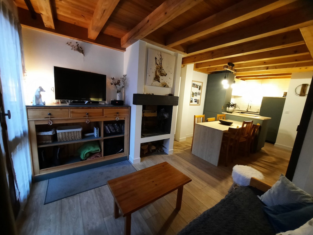 Je vous propose en location un appartement indépendant dans une petite maison accolée à la mienne. Environ 60 m², avec un séjour/cuisine au rez de jardin, une chambre et une salle de bain à l'étage. La cuisine est équipée, avec lave vaisselle, et vous disposerez également d'un lave linge. Je suis pour ma part accompagnateur en montagne, et je serai à même de vous renseigner au mieux pour vos activités dans le secteur, et vous prêter du matériel montagne si vous en avez besoin, avec plaisir!