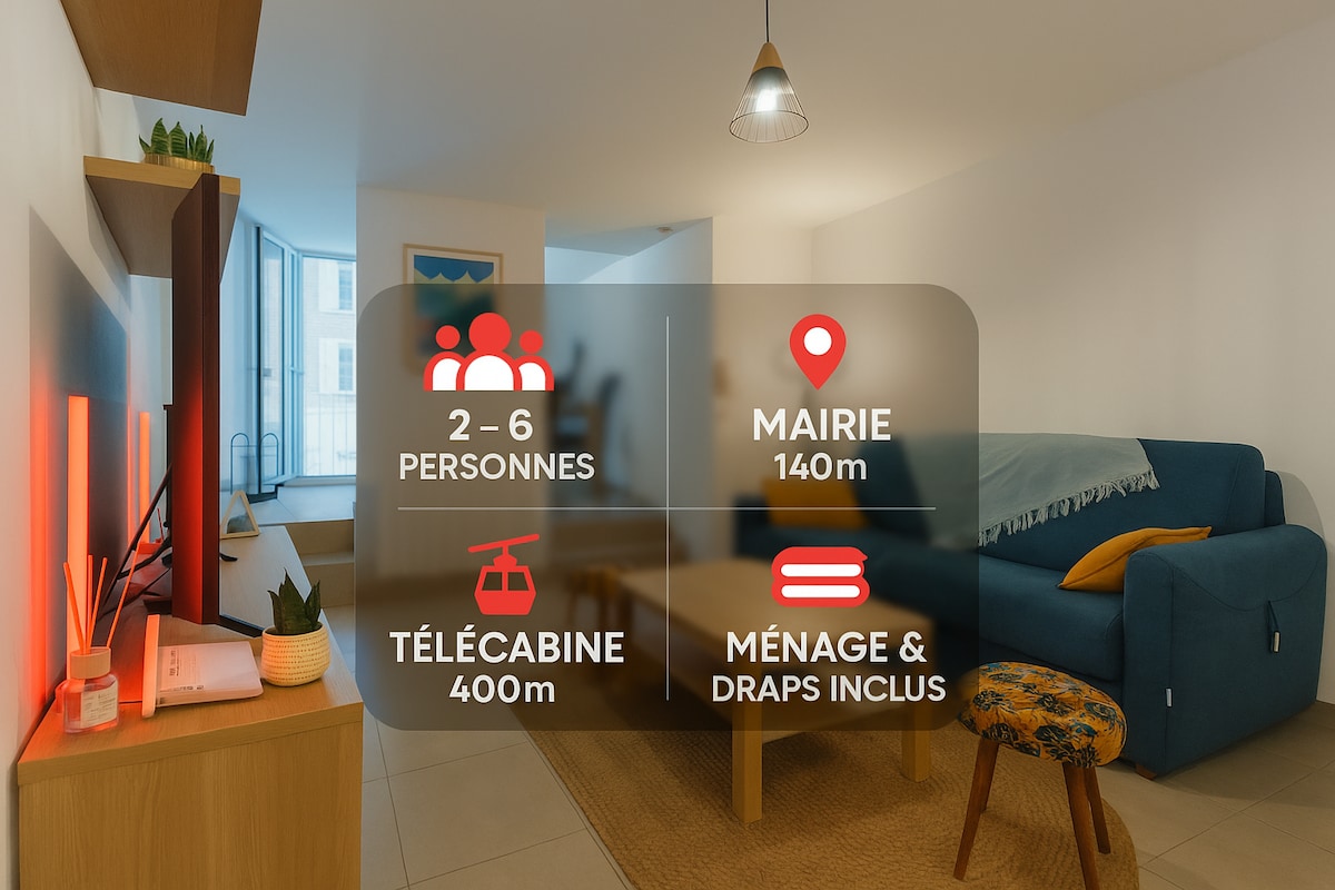 Appartement 100% cocooning, situé au deuxième étage d’une petite résidence. Emplacement calme tout en étant situé au coeur du village, avec un grand parking non privé. Un nid douillet de 35 m2 pour 4 personnes, chaleureux et raffiné. 100 m2 de terrasse et jardin privatif. Couchage: 1 chambre avec un lit en 140x190 et un grand dressing, Canapé lit avec un véritable matelas en 140x190 Lits faits à l’arrivée. Cuisine toute équipée. Salle de bain avec douche, WC indépendant. Draps de bain fournis.
