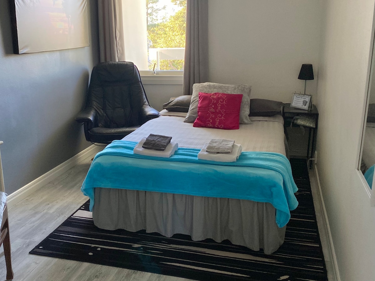 På väg från norr till söder eller någon annanstans? Två minuter från gamla E4an på Jungfrukusten landar du i ett eget rum med egen arbetsyta, bra wi-fi, läsfåtölj, lite böcker och tidningar och såklart en nybäddad säng. Detta i ett rymligt radhus med naturen in på knuten där vi delar gemensamma ytor som kök och vardagsrum. Och du! Kaffe finns alltid!!!